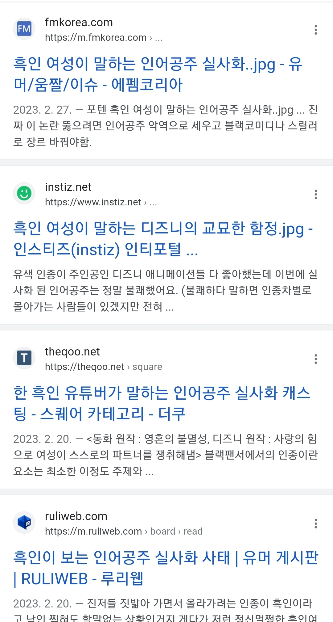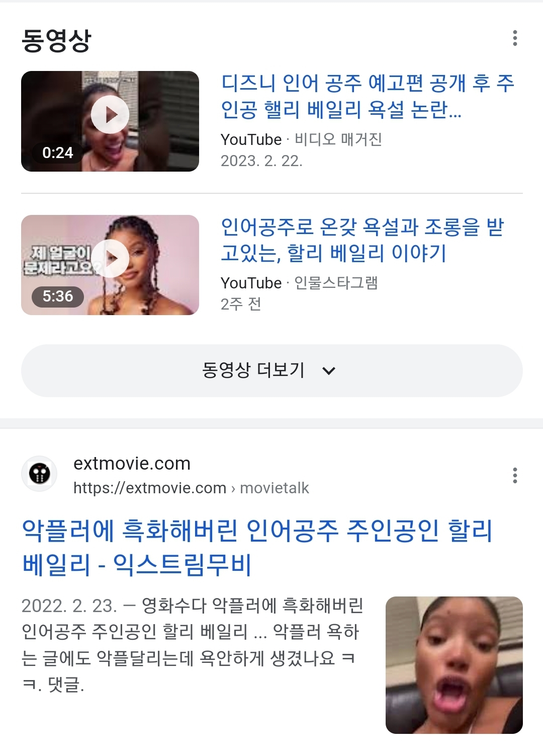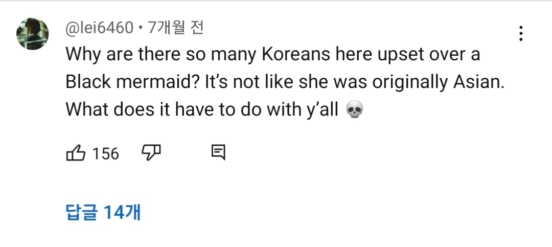할리 개인 브이로그 채널(심지어 영상도 인어공주 관련 x 고양이랑 노는 영상/메이크업 루틴/화보촬영 영상) 까지 가서 한국인들이 댓글테러함. 지금은 많이 지워졌는데 오죽했으면 베댓이 "왜이렇게 많은 한국인들이 흑인 인어공주에 화를 내는거야? 원래 아시안이거나 그랬던 것도 아니고 무슨 상관인데"임.