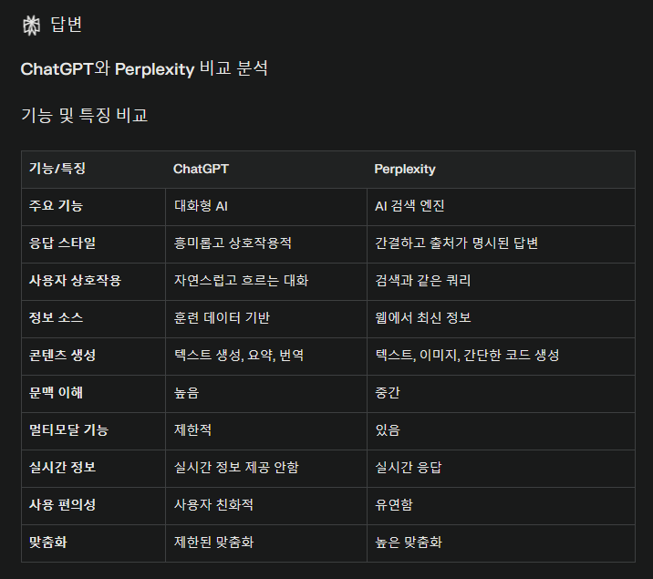 Chat GPT - Perplexity 비교해달라고 물어봄