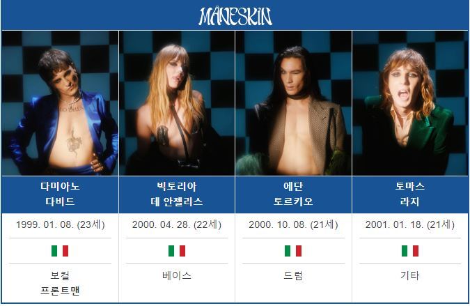 måneskin(모네스킨)이라는 밴드인데 한국에는 해외 명성에 비해 안 알려졌지만