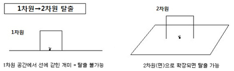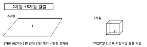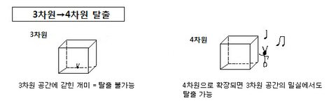 4차원 공간으로 이동함으로써 밀폐된 3차원 도형에서의 탈출이 가능해집니다.