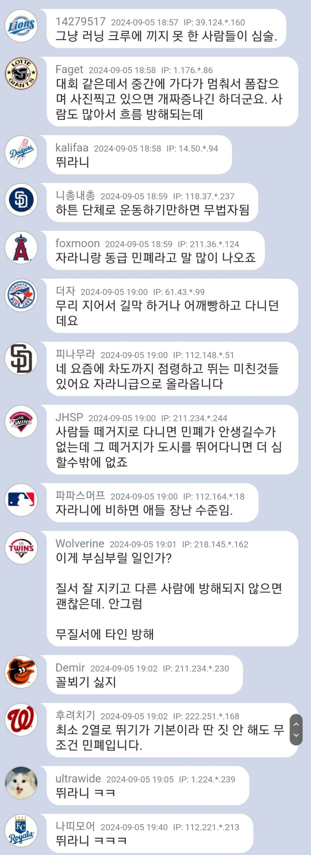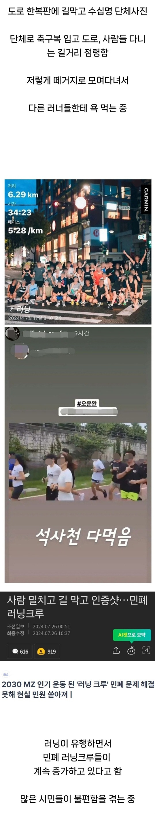 아님 둘 셋이서 소규모로 한 줄로 뛰면 되는데 왜 꼭 무리지어서 우르르 다니는 지 모를 일.. 개민폐