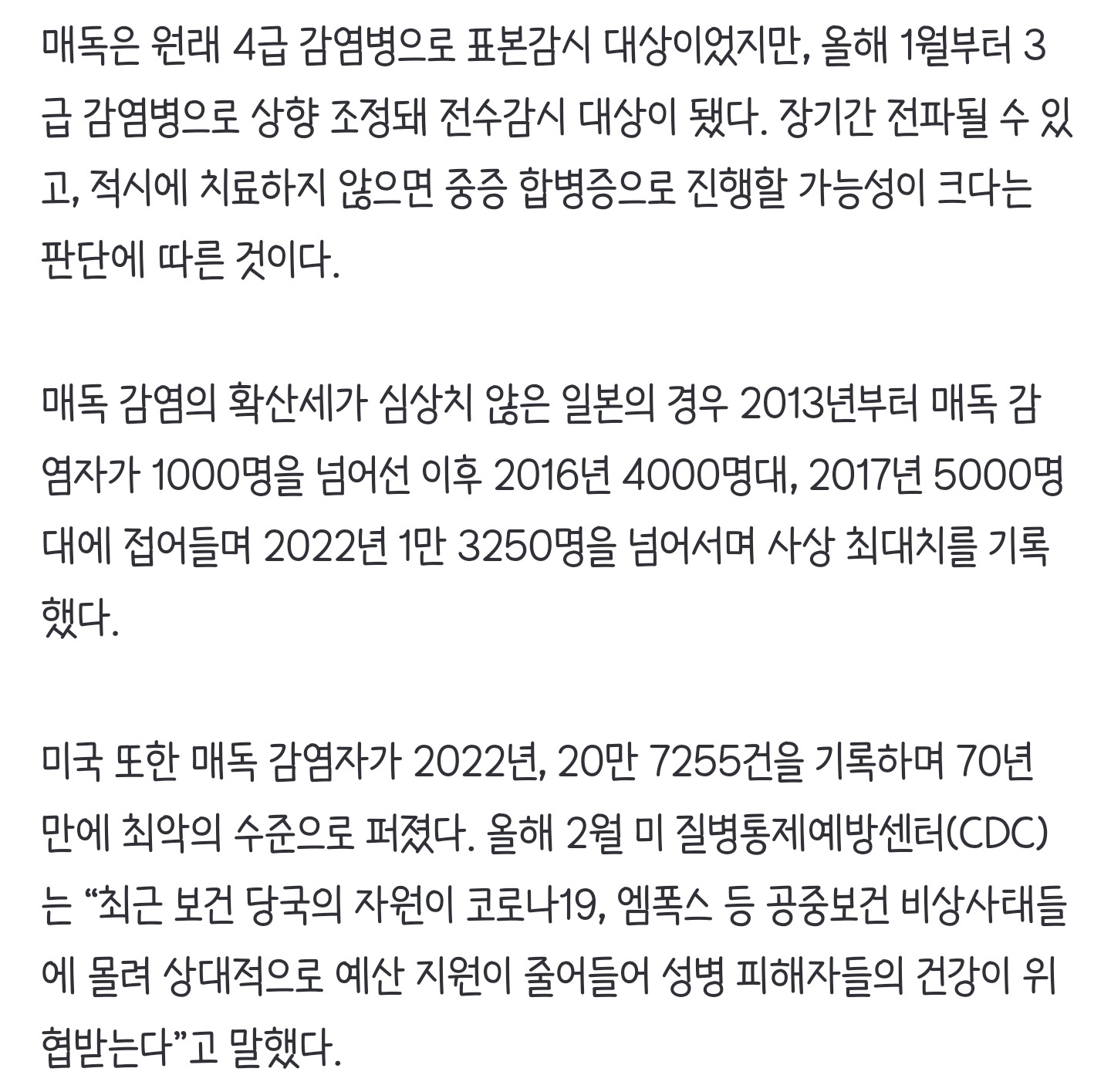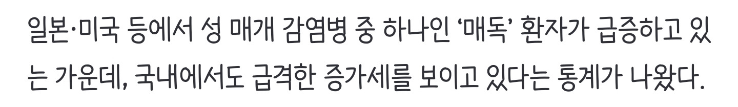 [여시뉴스데스크]합병증 위험 큰데… 올해 우리나라 ‘이 성병’ 환자 폭증했다 작성자너너뉘기야|작성시간24.09.11|조회수5,542 목록 댓글 15 글자크기 작게가 글자크기 크게가 출처: https://naver.me/xZVjFrPE합병증 위험 큰데… 올해 우리나라 ‘이 성병’ 환자 폭증했다일본·미국 등에서 성 매개 감염병 중 하나인 ‘매독’ 환자가 급증하고 있는 가운데, 국내에서도 급격한 증가세를 보이고 있다는 통계가 나왔다. 국회 보건복지위원회 소속 더불어민주당 서미n.news.naver.com중략 다음검색 현재 게시글 추가 기능 열기 북마크 공유하기 신고 센터로 신고 댓글 댓글 15 댓글쓰기 답글쓰기 댓글 리스트 작성자티라노사우르르르 | 작성시간 24.09.11 매독 완치되는건가??? 작성자불광동핵주먹 | 작성시간 24.09.11 심하다..진짜 뭔 매독 작성자밀레시안 | 작성시간 24.09.11 일본발 매독 이제 한국에 상륙했군병원못가니까 더기승일듯 작성자멀뚱… | 작성시간 24.09.11 매독은 성관계를 통해서만 전염되는거지?? 물도 같이 마시면 안되는건가?? 작성자피곤해죽겠어요 | 작성시간 24.09.12 으악 너무 더럽다 댓글 전체보기