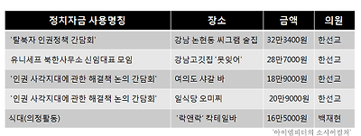 탈북자 간담회와 인권 간담회를 술집이나 칵테일바, 일식당에서 사용되었다는 것은, 명칭은 그렇게 해놓고 한마디로 밥먹고 술먹었다는 이야기입니다. 물론 사람인지라 간담회가 끝나고 간단한 식사와 음료를 마실 수 있습니다. 문제는 왜 강남의 술집이나 고깃집,일식당,칵테일바에서 해야 합니까?