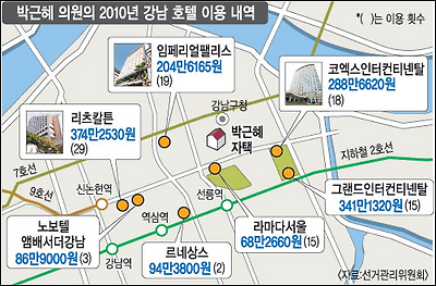 박근혜 의원은 항상 호텔에만 갑니다. 원래 공주님이라 그런지 모르겠지만, 무슨 모임을 해도 꼭 호텔을 갑니다. 그것도 강남에 있는 호텔입니다. 물론 호텔이 기자회견이나 비밀스런 회동을 하기에는 좋을 수 있습니다. 그러나 국회의원이 무슨 연예인입니까? 만남을 비밀로 숨기면서까지 호텔방에서 수십 차례 해야 할 이유가 무엇입니까?