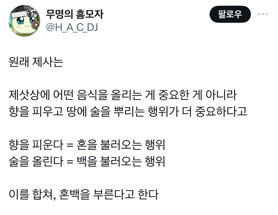 향을 피우고 땅에 술을 뿌리는 행위가 더 중요하다고