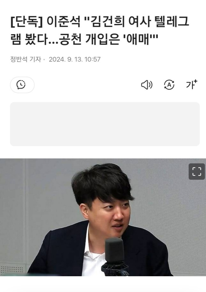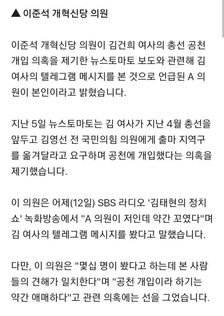 [여시뉴스데스크][단독] 이준석 "김건희 여사 텔레그램 봤다…공천 개입은 '애매'" 작성자사랑이 필요한거죠|작성시간24.09.13|조회수703 목록 댓글 1 글자크기 작게가 글자크기 크게가 출처: https://v.daum.net/v/20240913105700159[단독] 이준석 "김건희 여사 텔레그램 봤다…공천 개입은 '애매'"▲ 이준석 개혁신당 의원 이준석 개혁신당 의원이 김건희 여사의 총선 공천 개입 의혹을 제기한 뉴스토마토 보도와 관련해 김 여사의 텔레그램 메시지를 본 것으로 언급된 A 의원이 본인이라고 v.daum.net 다음검색 현재 게시글 추가 기능 열기 북마크 공유하기 신고 센터로 신고 댓글 댓글 1 댓글쓰기 답글쓰기 댓글 리스트 작성자exhaust | 작성시간 24.09.13 올해 공천개입보다 22년 보궐선거 공천이 더 큰 문제라 발빼는거지 그땐 이준석이 당대표라 지 책임이거든 김건희가 창원 보내라 해서 보냈겠지만 댓글 전체보기