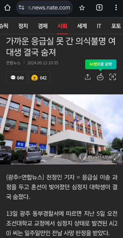 [스크랩] [여시뉴스데스크]가까운 응급실 못 가 의식불명 여대생 결국 숨져 작성자사랑이 필요한거죠|작성시간24.09.13|조회수3,667 목록 댓글 7 글자크기 작게가 글자크기 크게가 이런데도 국민들이 죽어간다는 뉴스가 가짜뉴스라는 말이 나오나?? 다음검색 스크랩 원문 : 이종격투기 현재 게시글 추가 기능 열기 북마크 공유하기 신고 센터로 신고 댓글 댓글 7 댓글쓰기 답글쓰기 댓글 리스트 작성자수 달 | 작성시간 24.09.13 이런데도 국민 죽어나간다는 게 가짜뉴스냐? 지금 며칠 새 몇 명이나 죽었단 뉴스 뜨고 있는데?? 작성자쁘띠 자몽 생크림 케이크 | 작성시간 24.09.13 삼가 고인의 명복을 빕니다 작성자짐정리중 | 작성시간 24.09.13 어떡해....삼가 고인의 명복을 빕니다.. 작성자꼬깔콘새우마요 | 작성시간 24.09.13 삼가 고인의 명복을 빕니다 작성자행복한날들만가득하기를 | 작성시간 24.09.13 삼가 고인의 명복을 빕니다 댓글 전체보기