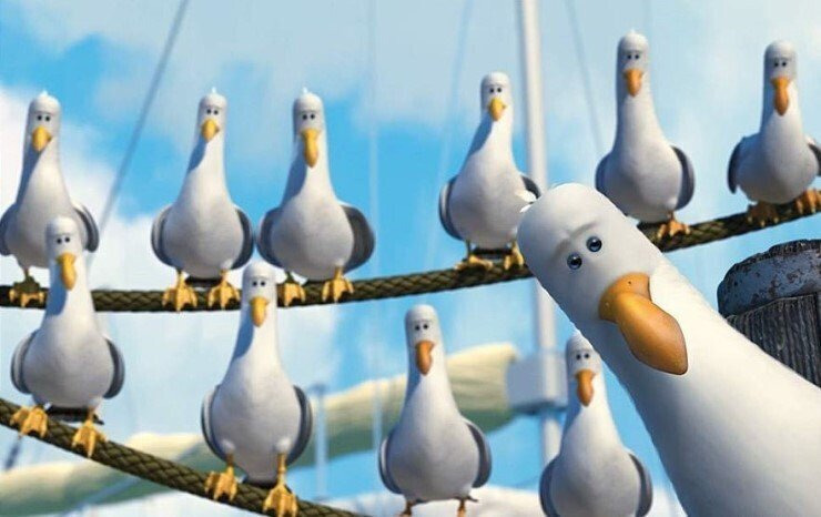 그리고 영화,니모를 찾아서에 멍청하고 순한 모습으로 나와 '갈매기는 지능이 낮아 멍청하고 순한 새다!'라는 인식이 새겨졌는데,