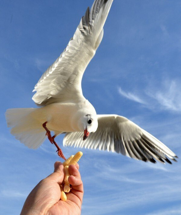 심지어 몇몇 갈매기들은 아예 배에 자리를 잡고 앉아서 인간이 주는 과자를 받아먹기도 한다.