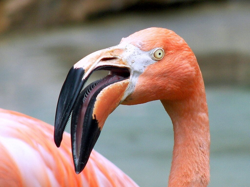 플라밍고는 입을 물에 넣고 휘저으며 이빨을 마치 그물처럼 이용해 물은 걸러내고 먹이들을 잡아먹는데