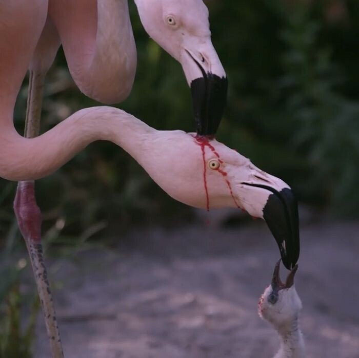 여담으로 플라밍고 동족포식이라고 알려져있는 이 짤은 사실 새끼에게 식도에서 나오는 젖 비슷한 액체인 크롭밀크를 먹이는 사진인데 크롭밀크의 색이 붉은색이다.
