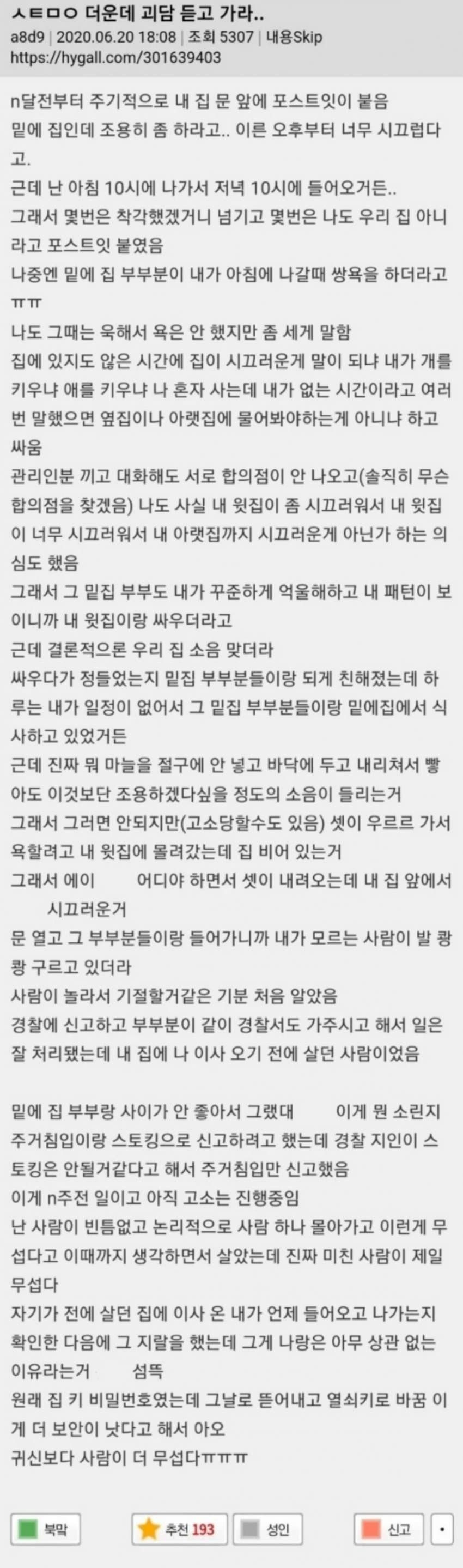 [흥미돋]층간소음 괴담 썰 (귀신 안나옴) 작성자요가허접|작성시간24.09.14|조회수14,907 목록 댓글 16 글자크기 작게가 글자크기 크게가 출처: 여성시대 요가허접 다음검색 현재 게시글 추가 기능 열기 북마크 공유하기 신고 센터로 신고 댓글 댓글 16 댓글쓰기 답글쓰기 댓글 리스트 작성자나라혼자쓰나 | 작성시간 24.09.14 비번바꿔도 그 카드대면 열리는거있자나 그거일수도 작성자shenyueyeah | 작성시간 24.09.14 내동생도 전에 살던 사람이 해놓은 비번 그대로 씀... 작성자내일이토요일이었으면 | 작성시간 24.09.14 충격이다진심 작성자스피또당첨이될거시다 일등 | 작성시간 24.09.14 개소름이네 작성자이거는아니지예 | 작성시간 24.10.01 비번 바꿔도 마스터키로 열었을듯.. 개소름 댓글 전체보기