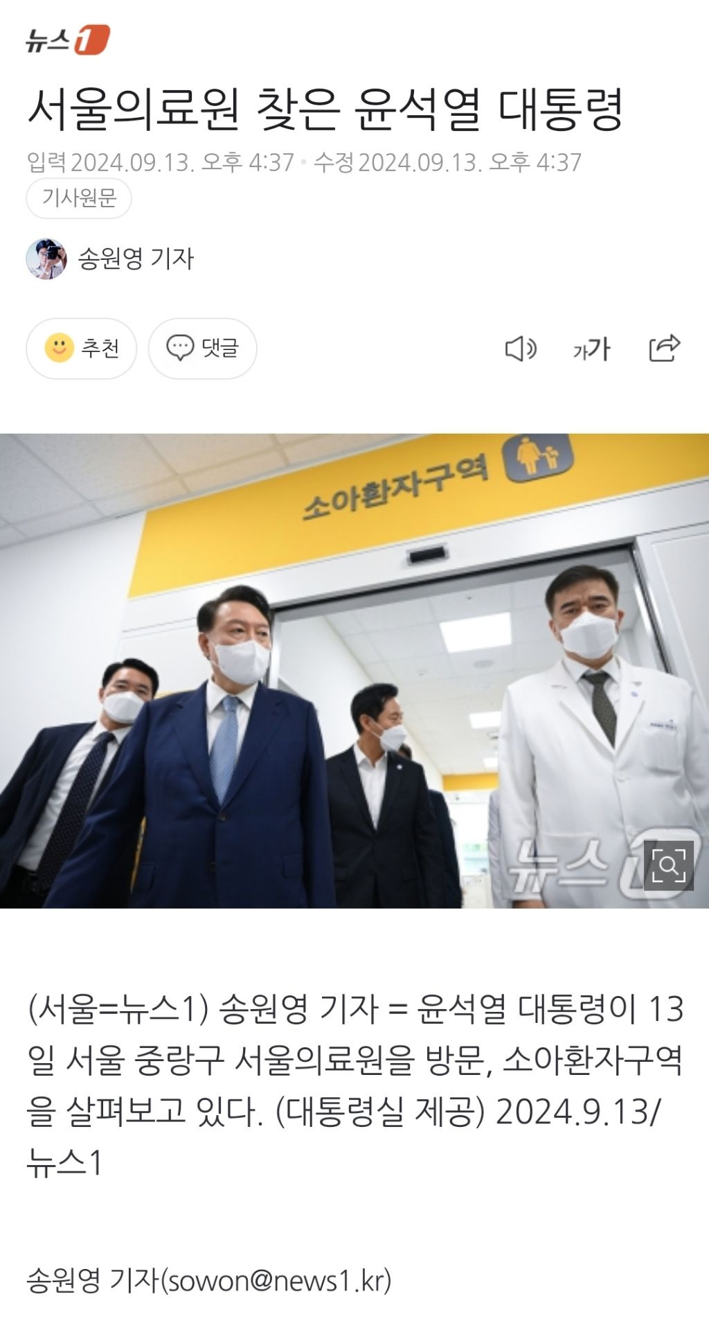 [여시뉴스데스크]서울의료원 찾은 윤석열 대통령 작성자천리길|작성시간24.09.14|조회수2,044 목록 댓글 13 글자크기 작게가 글자크기 크게가 출처: https://naver.me/5apjX1Cq서울의료원 찾은 윤석열 대통령윤석열 대통령이 13일 서울 중랑구 서울의료원을 방문, 소아환자구역을 살펴보고 있다. (대통령실 제공) 2024.9.13/뉴스1n.news.naver.com🔗관련 기사https://naver.me/FXwndkQ5[뉴스1 PICK]윤석열 대통령, 서울의료원·중앙응급의료센터 방문윤석열 대통령이 13일 추석 연휴를 앞두고 서울의료원과 중앙응급의료센터를 방문해 응급의료 대응 상황을 점검하고, 의료진의 노고를 격려했다. 먼저 서울 중랑구에 위치한 서울의료원을 찾은n.news.naver.comhttps://m.asiatoday.co.kr/kn/view.php?key=20240913010009334응급실 의료진 만난 尹 “최소한의 인력 증원…오해하지 않았으면”윤석열 대통령은 13일 서울의료원·중앙응급의료센터를 방문한 자리에서 의과대학 증원을 비롯한 정부의 의료개혁을 설명하며 “장기계획 차원에서 최소한의 인력 증원이라는 점과 과학적 추www.asiatoday.co.krhttps://naver.me/GDaQqGh7서울의료원 권역응급의료센터 찾은 윤석열 대통령윤석열 대통령이 13일 서울 중랑구 서울의료원 권역응급의료센터를 찾아 설명을 들으며 둘러보고 있다. 왼쪽 뒤는 이현석 의료원장. 왼쪽 앞은 박현경 응급의료센터장. (사진=대통령실 제공) 2024n.news.naver.com 다음검색 현재 게시글 추가 기능 열기 북마크 공유하기 신고 센터로 신고 댓글 댓글 13 댓글쓰기 답글쓰기 댓글 리스트 작성자뻑금뻑금 | 작성시간 24.09.14 뭐 어쩌자고 씨뱅아 작성자짤랑Ol | 작성시간 24.09.14 뭘 쳐 돌아다니기만 해 작성자똥구멍확장 | 작성시간 24.09.14 어쩐지 어제 출근길에 서울의료원 앞 지나는데 경찰들이 교통 통제하고 경호원으로 보이는 사람들 많았어...그래서 누구 오나? 했는데...ㅎㅎㅎ 작성자옹오우엉 | 작성시간 24.09.14 산책코스를 병원으로 정했노 작성자토착왜구침몰 | 작성시간 24.09.14 ㅈㄹ 댓글 전체보기