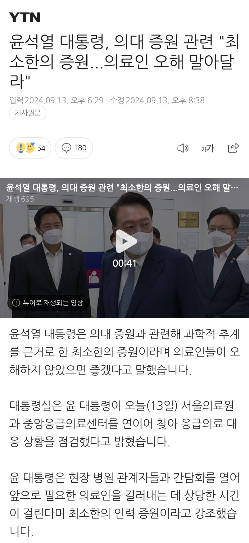 [여시뉴스데스크]윤석열 대통령, 의대 증원 관련 "최소한의 증원...의료인 오해 말아달라" 작성자천리길|작성시간24.09.14|조회수532 목록 댓글 4 글자크기 작게가 글자크기 크게가 출처: https://naver.me/FFGq74Fm윤석열 대통령, 의대 증원 관련 "최소한의 증원...의료인 오해 말아달라"윤석열 대통령은 의대 증원과 관련해 과학적 추계를 근거로 한 최소한의 증원이라며 의료인들이 오해하지 않았으면 좋겠다고 말했습니다. 대통령실은 윤 대통령이 오늘(13일) 서울의료원과 중n.news.naver.com이하 생략전문 출처로 다음검색 현재 게시글 추가 기능 열기 북마크 공유하기 신고 센터로 신고 댓글 댓글 4 댓글쓰기 답글쓰기 댓글 리스트 작성자몽글몽글무새 | 작성시간 24.09.14 그러니까 추산 근거 내놓으라고 작성자네다제얼 | 작성시간 24.09.14 가로수도 2천그루 심는다고하고. 과학적 추산이 아니라 천공 추산 아님? 뭐든지 2천~~ 작성자어디로가세요 | 작성시간 24.09.14 근거도 못대던데 회의록도 파기하고.. 작성자후움움 | 작성시간 24.09.14 비과학적인 수치를 주장해놓고 의료계에 과학적 근거를 대라는게 무슨 코메디임ㅋㅋㅋㅋ 적반하장도 유분수. 의료와 교육을 망친 대통령이 자리보전할거같냐? 댓글 전체보기