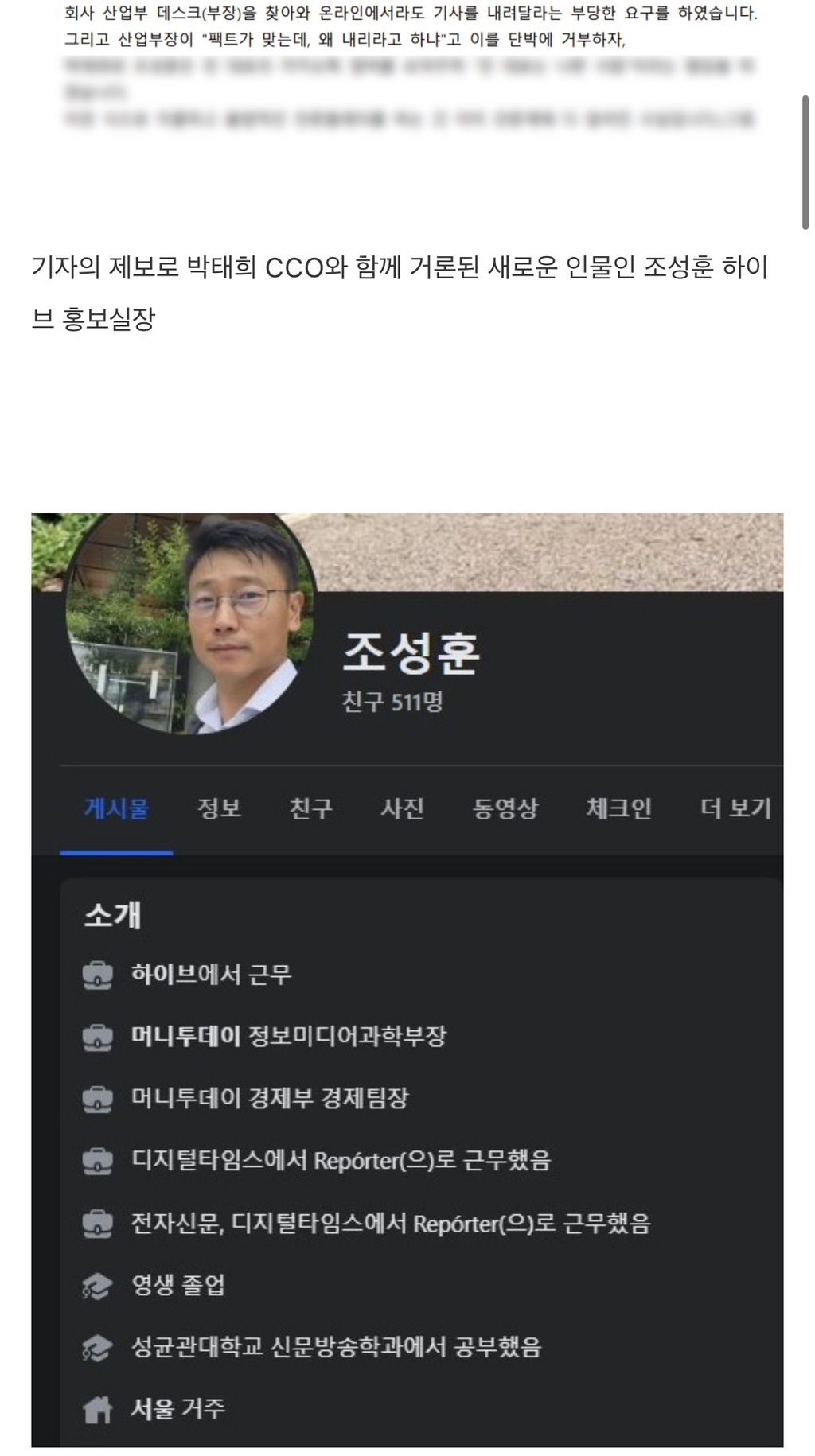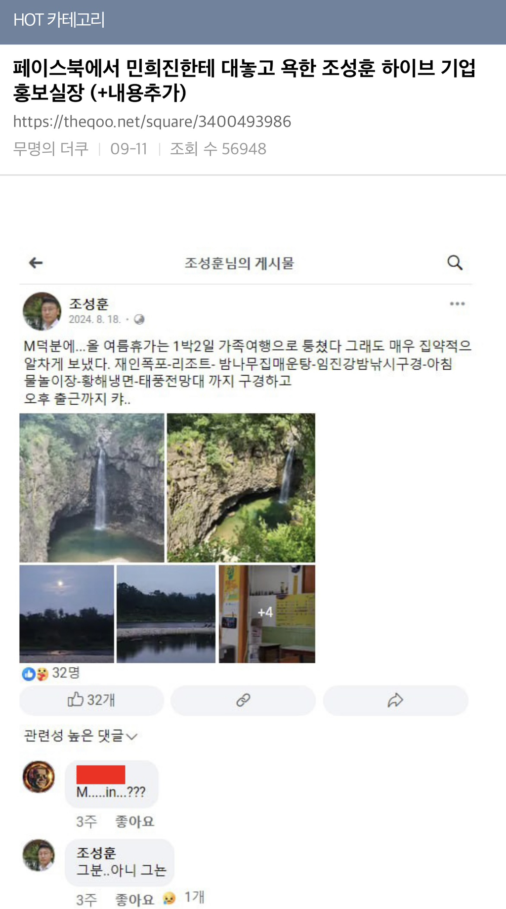 [흥미돋]페이스북에서 민희진한테 대놓고 욕한 조성훈 하이브 기업 홍보실장 (+내용추가) 작성자COCOAo|작성시간24.09.15|조회수5,682 목록 댓글 27 글자크기 작게가 글자크기 크게가 출처: https://theqoo.net/square/3400493986더쿠 - 페이스북에서 민희진한테 대놓고 욕한 조성훈 하이브 기업홍보실장 (+내용추가)여기를 눌러 링크를 확인하세요theqoo.net 다음검색 현재 게시글 추가 기능 열기 북마크 공유하기 신고 센터로 신고 댓글 댓글 27 댓글쓰기 답글쓰기 댓글 리스트 작성자아이잇나아참 | 작성시간 24.09.15 와....sns에....ㅎㅎ 작성자ariana tall | 작성시간 24.09.15 수준 알 만하다 ㅋㅋ.. 작성자anewnickname | 작성시간 24.09.16 진짜 개저씨같아 작성자고기고기빔 | 작성시간 24.09.16 에고 하필 sns를 했냐 ㅋㅋㅋㅋㅋㅋㅋㅋ 하지말지 ㅋㅋㅋㅋㅋㅋ 작성자리리리릴ㄹ | 작성시간 24.09.16 공개적으로 ㅋㅋ 창피한줄 아세요 개저씨야 댓글 전체보기