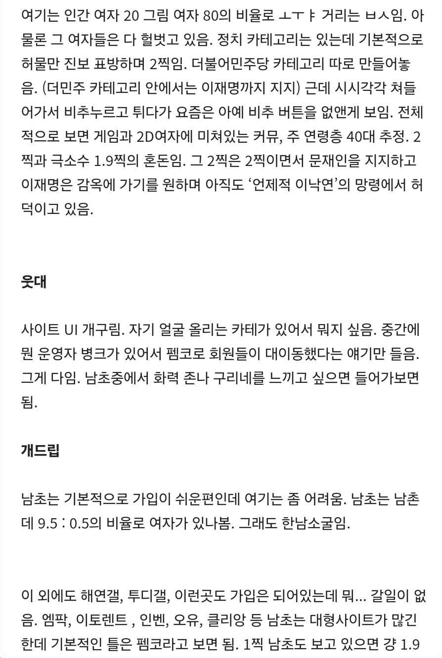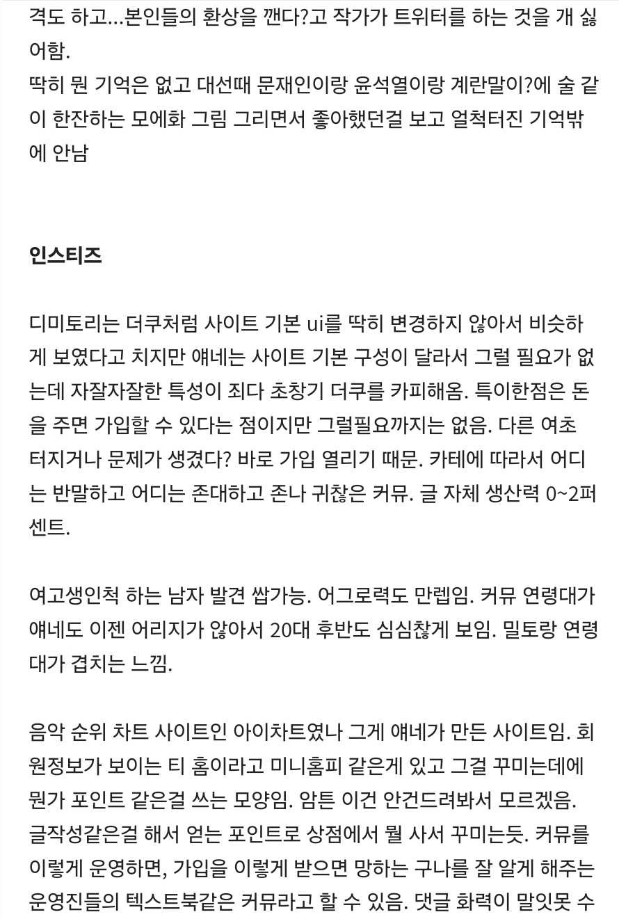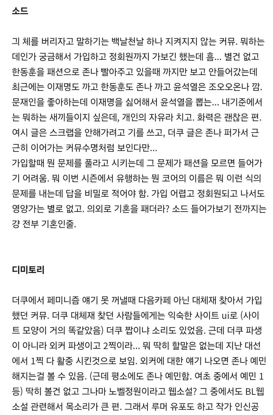 작성자다리가 화끈 작성시간 24.09.16 난 외커 똥꼬충들 때문에 망하고 여시왔었는데...가끔 외커가 그립지만 디미토리는 정이 안 붙어서 못가겠더라 게다가 2찍ㅋㅋㅡㅡ