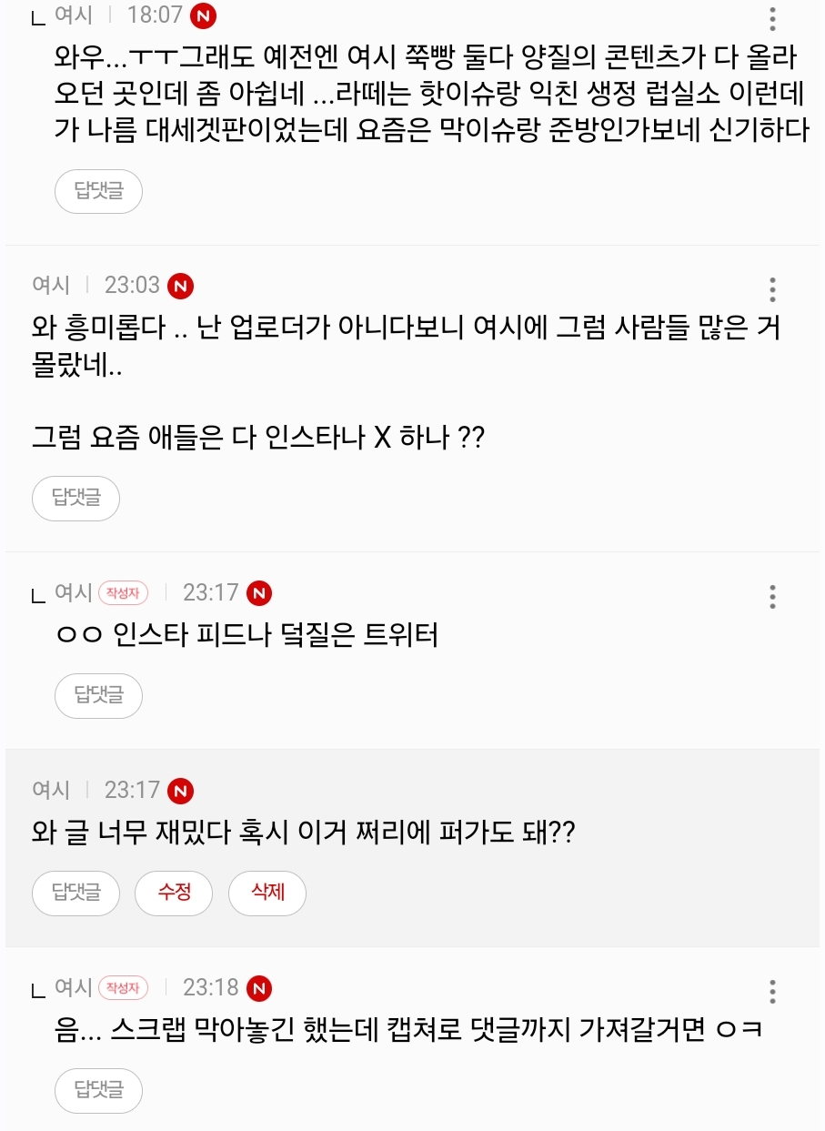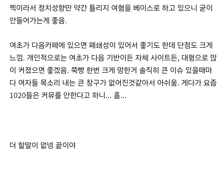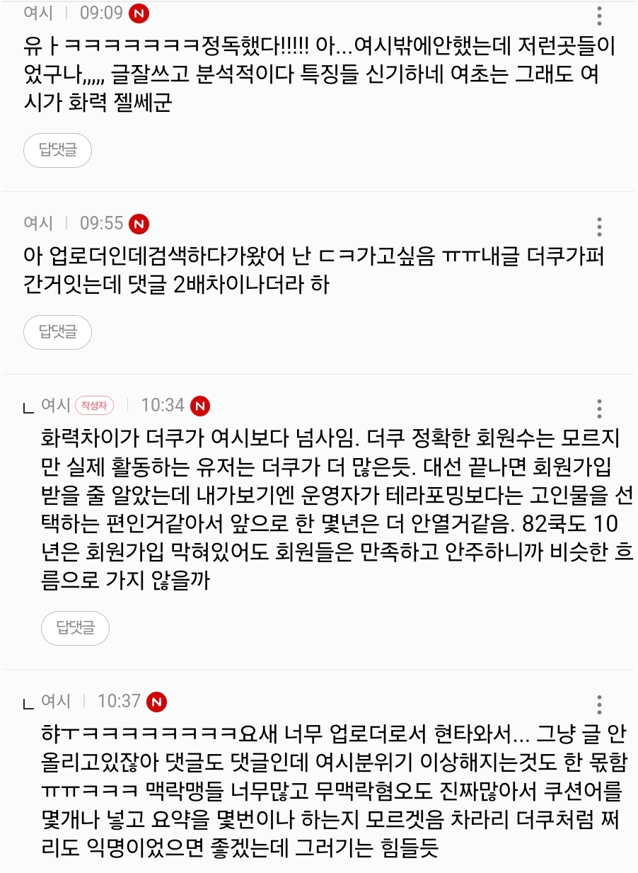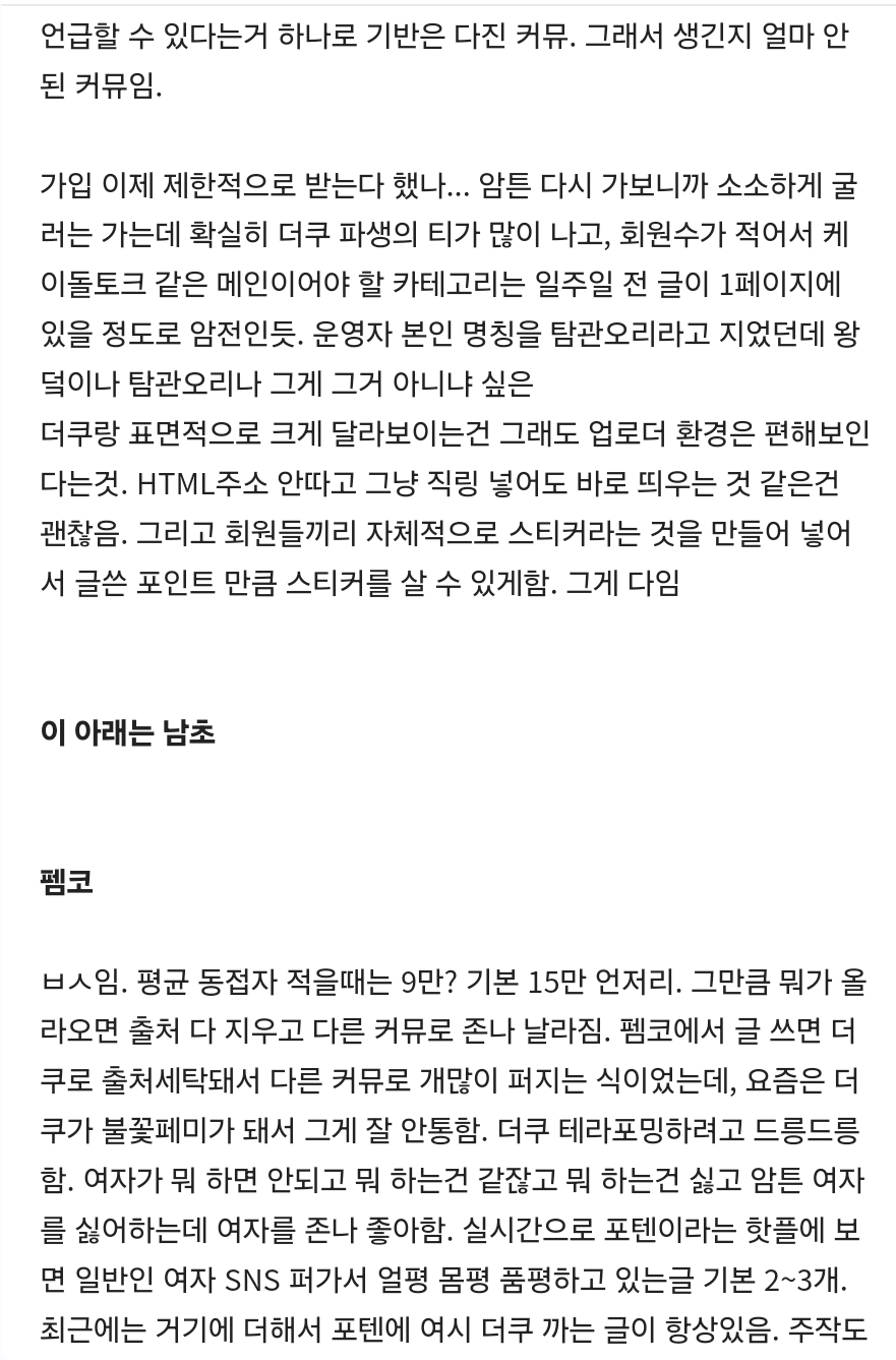 작성자다리가 화끈 작성시간 24.09.16 난 외커 똥꼬충들 때문에 망하고 여시왔었는데...가끔 외커가 그립지만 디미토리는 정이 안 붙어서 못가겠더라 게다가 2찍ㅋㅋㅡㅡ