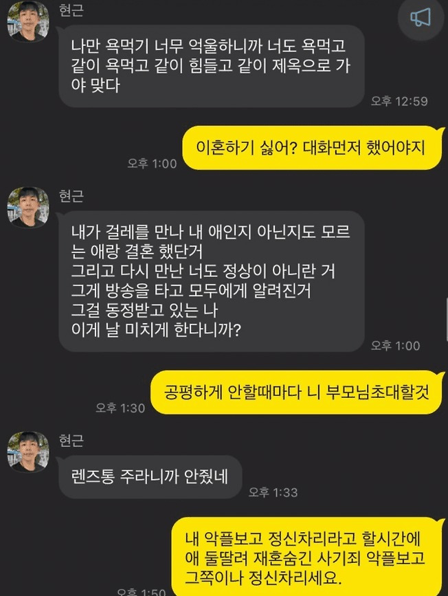 대화에 따르면 남편은 "나만 욕 먹기 너무 억울하니까 너도 욕 먹고 같이 욕 먹고 같이 힘들고 같이 지옥으로 가야 맞다"고 말했다. 이에 아내는 "이혼하기 싫어? 대화 먼저 했어야지"라고 반응했다.