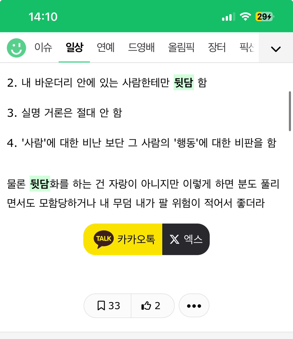 작성자아마겟던 작성시간 24.09.18 난 걍 아예 만날 일 없는 사람 대상으로만 함 대학에서 만난 서울 출신 친구에 대한 이야기는 김해에 있는 고향 초딩 동창한테 함 ㅋㅋㅋㅋㅋ뒷담 아예 단 하나도 안하고 사는 사람 몇이나 될 지 모르겠고(내기준 커뮤에 글 쓰는 거나 엄마한테 말하는 것도 다 뒷담이라) 걍 스트레스 ㅈㄴ 받느니 푸는 게 나은 것 같아.. ㅠ