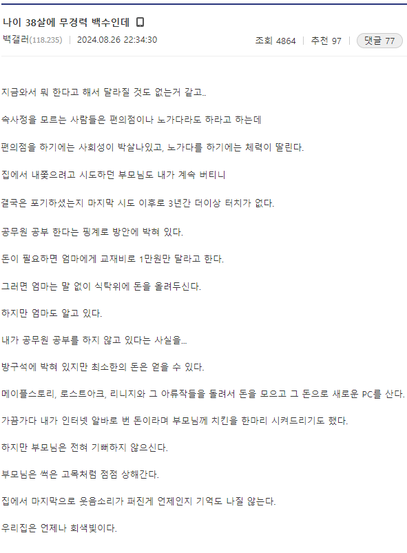작성자체리개맛있다 작성시간 24.09.18 저기 모여있으면 서로 위안받으면서 계속 저 상황에서 안주하겠네... 언제까지 은은한 자기혐오나 죄책감을 느끼면서 살 생각일까. 부모님 돌아가실때까지?