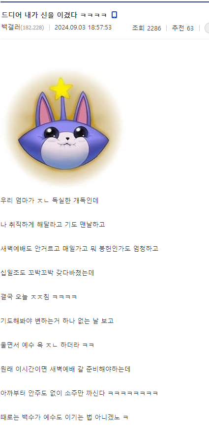 작성자설탕왕감자 작성시간 24.09.18 천장에 목매달고 셀프낙태 하시길 바라겟읍니다