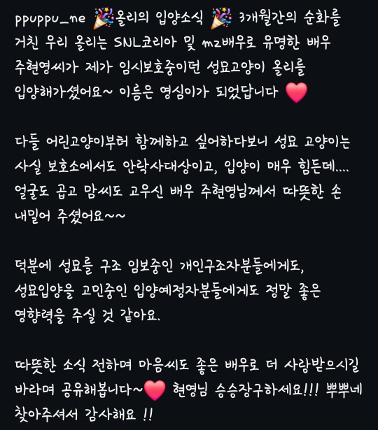 [힐링]주현영 유기묘 성묘(길고양이) 입양 작성자졸려죽어칷|작성시간24.09.21|조회수113,669 목록 댓글 200 글자크기 작게가 글자크기 크게가 출처: 여성시대 졸려죽어칷성묘는 사랑입니다사지말고 입양하세요 주현영 배우 최고 영심아 행복하걸아~~~++원래도 고속도로에 있던 구조한 새끼고양이 입양했었대주현영 배우 버블 다음검색 현재 게시글 추가 기능 열기 북마크 공유하기 신고 센터로 신고 댓글 댓글 200 댓글쓰기 답글쓰기 댓글 리스트 작성자어차피상관없음 | 작성시간 24.09.23 냥이도 넘 기엽다❤️ 행복한냥생보내길 작성자감정조절의어려움 | 작성시간 24.09.23 너무 좋아 😭 정말 멋지고 따수운 사람…💕💕 작성자아이바오러바오푸바오 | 작성시간 24.09.23 난 진짜 현영 너무 좋아ㅠㅠ 작성자슈크림케이크 | 작성시간 24.09.26 진짜 대박 ㅠㅠ 천사다!!! 흥하세요 더더더 작성자미래재벌 | 작성시간 24.09.29 와 주현영씨 너무 좋은 사람........ 앞으로 무족권 응원할게요 ㅠㅠㅠㅠㅠㅠㅠㅠㅠ 댓글 전체보기