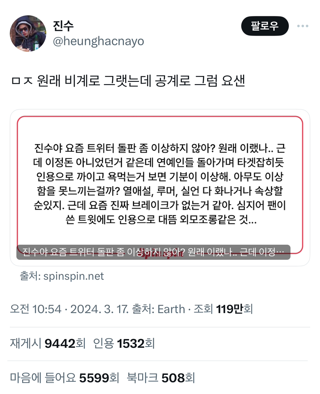 인용트윗(비공계 계정 아니면 원글 쓴 사람한테 다 보이고 알림감)으로 욕박는 사람 개많아짐;; -