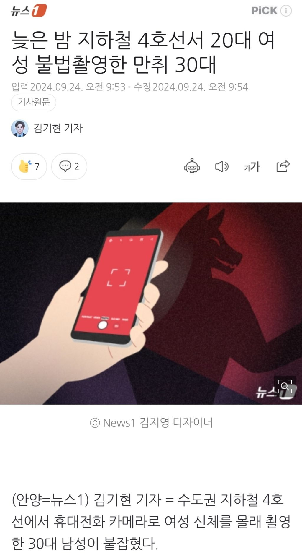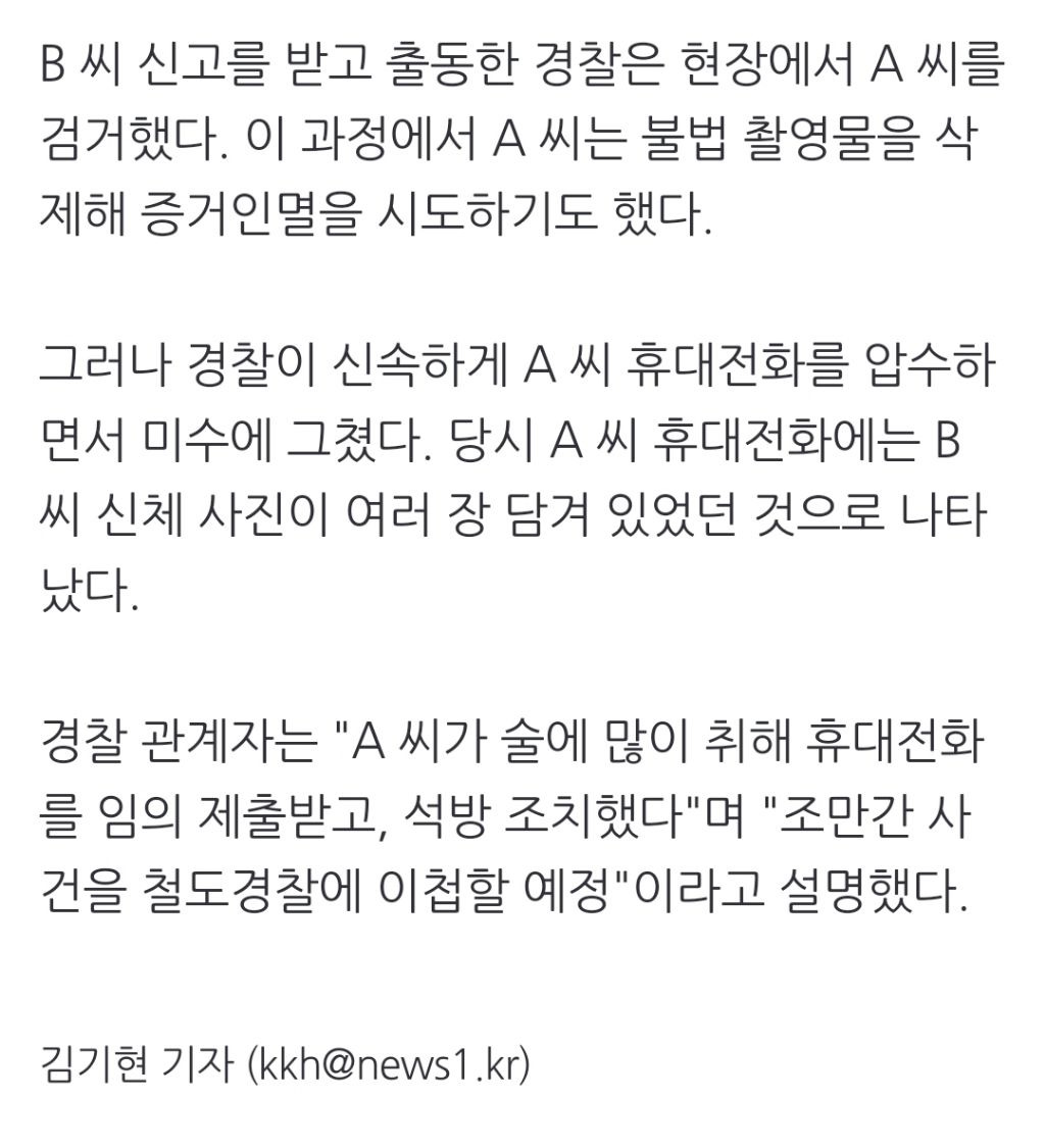 [여시뉴스데스크]늦은 밤 지하철 4호선서 20대 여성 불법촬영한 만취 30대 작성자천리길|작성시간24.09.25|조회수1,298 목록 댓글 2 글자크기 작게가 글자크기 크게가 출처: https://naver.me/Gq85crgX늦은 밤 지하철 4호선서 20대 여성 불법촬영한 만취 30대수도권 지하철 4호선에서 휴대전화 카메라로 여성 신체를 몰래 촬영한 30대 남성이 붙잡혔다. 경기 안양동안경찰서는 성폭력범죄의 처벌 등에 관한 특례법 위반(카메라 등 이용촬영) 혐의로 A 씨n.news.naver.com중략🔗관련 기사https://naver.me/xLWzfR57지하철에서 여성 신체 몰래 촬영한 30대 체포지하철 안에서 여성 승객의 신체 일부를 몰래 촬영한 30대 남성이 붙잡혔다. 24일 경기 안양동안경찰서에 따르면 전날 오후 10시 30분께 안양시 동안구를 지나는 지하철 4호선 안에서 "한 남성이 n.news.naver.com 다음검색 현재 게시글 추가 기능 열기 북마크 공유하기 신고 센터로 신고 댓글 댓글 2 댓글쓰기 답글쓰기 댓글 리스트 작성자파란고리문어 | 작성시간 24.09.25 대단하다 증말... 취한채로도 찍은 거면 맨정신으로는 얼마나 찍었을까 작성자수원이 | 작성시간 24.09.25 진짜 끊임없다 댓글 전체보기