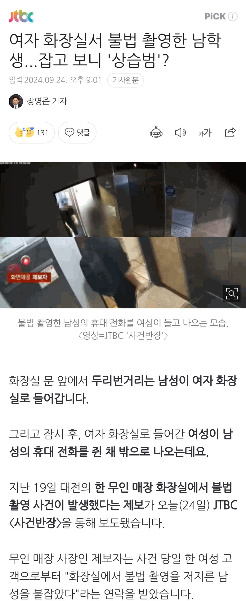[여시뉴스데스크]여자 화장실서 불법 촬영한 남학생...잡고 보니 '상습범'? 작성자천리길|작성시간24.09.25|조회수1,034 목록 댓글 3 글자크기 작게가 글자크기 크게가 출처: https://naver.me/59vOZlLc여자 화장실서 불법 촬영한 남학생...잡고 보니 '상습범'?화장실 문 앞에서 두리번거리는 남성이 여자 화장실로 들어갑니다. 그리고 잠시 후, 여자 화장실로 들어간 여성이 남성의 휴대 전화를 쥔 채 밖으로 나오는데요. 지난 19일 대전의 한 무인 매장 n.news.naver.com이하 생략전문 출처로 다음검색 현재 게시글 추가 기능 열기 북마크 공유하기 신고 센터로 신고 댓글 댓글 3 댓글쓰기 답글쓰기 댓글 리스트 작성자추워요갑자기 | 작성시간 24.09.25 뉴스에 나오는것만 해도 매일 쏟아지는데 보도 안된건 얼마나 많을까.. 한남들 싹다 살처분 하고싶어짐 작성자Null만나면 | 작성시간 24.09.25 저건 정신병이니까 정신병원에 쳐 넣어라 ㅡㅡ 작성자퉁퉁이마덜모퉁이 | 작성시간 24.09.25 사형시키자 댓글 전체보기