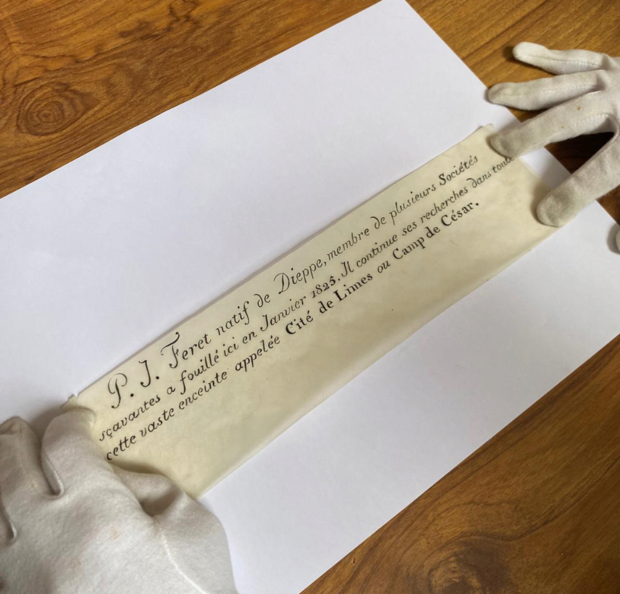 해석해보니: "디에프 출신의 P.J. 페레는 여러 학술 사회의 회원으로, 1832년 1월 이곳에서 발굴을 진행했다. 그는 Limes 도시 또는 카이사르 캠프라고 불리는 이 넓은 구역에서 그의 연구를 계속하고 있다"