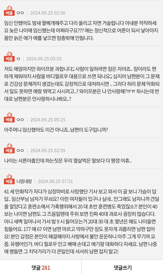 작성자래번클로 작성시간 24.09.25 로맨스 소설 남주들은 해주던데.. 역시 현실 남자들하고는 결혼하지 말아야겠다