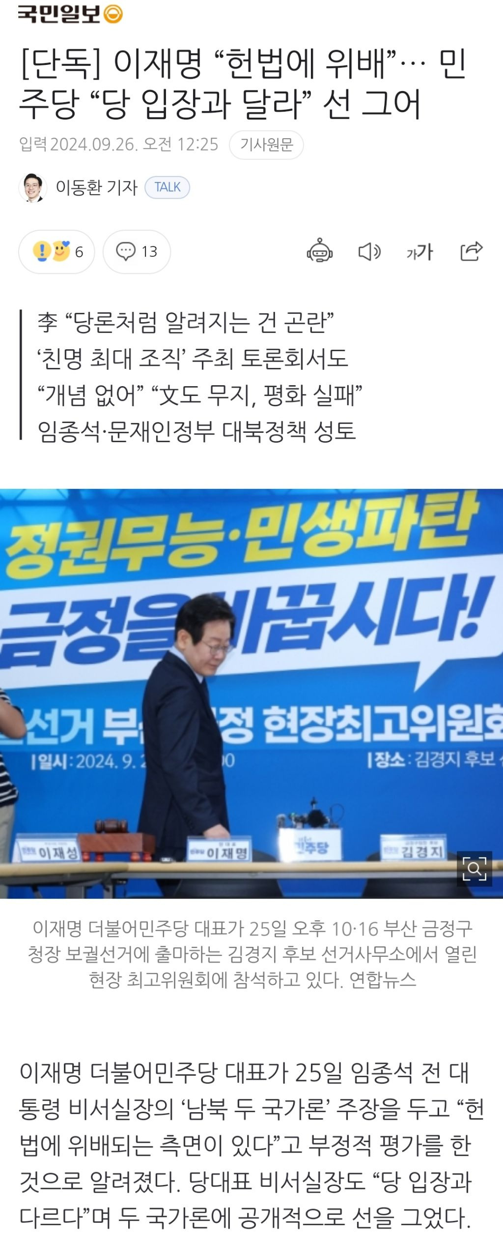 [여시뉴스데스크]이재명 “헌법에 위배”… 민주당 “당 입장과 달라” 선 그어 작성자천리길|작성시간24.09.26|조회수1,292 목록 댓글 3 글자크기 작게가 글자크기 크게가 출처: https://naver.me/x3jYQitN[단독] 이재명 “헌법에 위배”… 민주당 “당 입장과 달라” 선 그어이재명 더불어민주당 대표가 25일 임종석 전 대통령 비서실장의 ‘남북 두 국가론’ 주장을 두고 “헌법에 위배되는 측면이 있다”고 부정적 평가를 한 것으로 알려졌다. 당대표 비서실장도 “n.news.naver.com이하 생략전문 출처로 다음검색 현재 게시글 추가 기능 열기 북마크 공유하기 신고 센터로 신고 댓글 댓글 3 댓글쓰기 답글쓰기 댓글 리스트 작성자조쉬 코헨 | 작성시간 24.09.26 기사 제목 꼬라지 봐라 기사제목이 내용 파악 1도 안되게 쓰는걸 기사라고 해도 되나 작성자NewJeans! | 작성시간 24.09.26 이동환 가짜뉴스 기자구나 작성자봄이가나봄 | 작성시간 24.09.26 뭐야 제목 댓글 전체보기