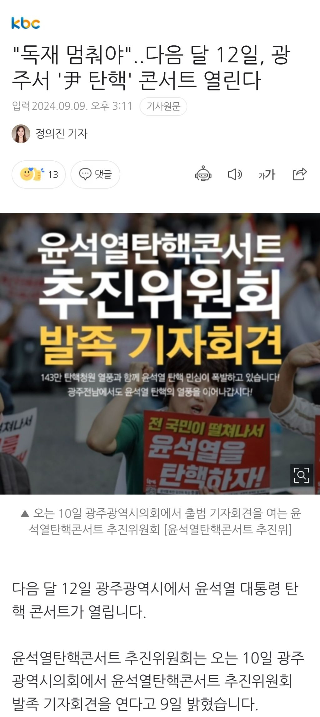 [스크랩] [여시뉴스데스크]"독재 멈춰야"..다음 달 12일, 광주서 '尹 탄핵' 콘서트 열린다 (⮕10월 12일 금남로) 작성자천리길|작성시간24.09.26|조회수397 목록 댓글 4 글자크기 작게가 글자크기 크게가 출처: https://naver.me/G7VCf1p4"독재 멈춰야"..다음 달 12일, 광주서 '尹 탄핵' 콘서트 열린다다음 달 12일 광주광역시에서 윤석열 대통령 탄핵 콘서트가 열립니다. 윤석열탄핵콘서트 추진위원회는 오는 10일 광주광역시의회에서 윤석열탄핵콘서트 추진위원회 발족 기자회견을 연다고 9일n.news.naver.com이하 생략전문 출처로 다음검색 스크랩 원문 : *여성시대* 차분한 20대들의 알흠다운 공간 현재 게시글 추가 기능 열기 북마크 공유하기 신고 센터로 신고 댓글 댓글 4 댓글쓰기 답글쓰기 댓글 리스트 작성자문프잼시빅스안산유지민나레츠고 | 작성시간 24.09.26 가고싶다........ 아빠 치과 안가면 가야지 .....경남사람이지만 가도 되죠 ? 답댓글 작성자아이큥 | 작성시간 24.09.26 언넝오소 답댓글 작성자문프잼시빅스안산유지민나레츠고 | 작성시간 24.09.26 그러면 갑니다...껄껄껄 광주 사랑해 작성자백은영은 다시(10) | 작성시간 24.09.26 약무호남 시무국가❗️❗️❗️ 댓글 전체보기