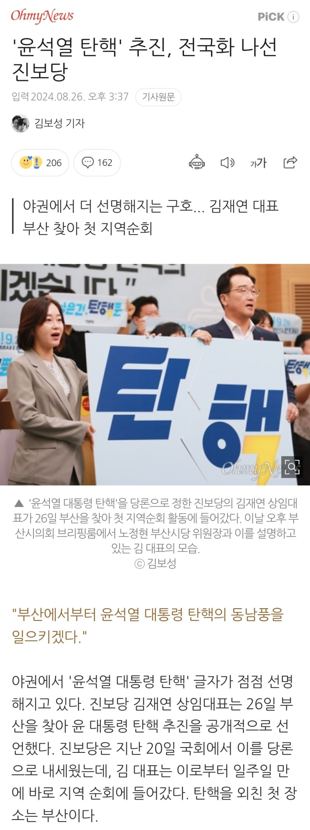 [스크랩] [여시뉴스데스크]'윤석열 탄핵' 추진, 전국화 나선 진보당 작성자천리길|작성시간24.09.26|조회수379 목록 댓글 1 글자크기 작게가 글자크기 크게가 출처: https://naver.me/FhUd5XCL'윤석열 탄핵' 추진, 전국화 나선 진보당▲ '윤석열 대통령 탄핵'을 당론으로 정한 진보당의 김재연 상임대표가 26일 부산을 찾아 첫 지역순회 활동에 들어갔다. 이날 오후 부산시의회 브리핑룸에서 노정현 부산시당 위원장과 이를 설n.news.naver.com이하 생략전문 출처로🔗관련 기사https://naver.me/57V8PKpP진보당 "부산부터 '윤석열 탄핵' 동남풍 일으킬 것"윤석열 대통령 탄핵을 당론으로 정한 진보당이 부산에서 지역순회 일정에 돌입하며 공감대 형성에 나섰다. 김재연 진보당 상임대표는 26일 오후 부산시의회 브리핑룸에서 기자회견을 열고, "윤n.news.naver.comhttps://naver.me/GfCMJ9Rh김재연 진보당 상임대표 "尹 탄핵이 진보당의 당론"부산을 방문한 김재연 진보당 상임대표가 윤석열 대통령의 탄핵을 당론으로 결정했음을 밝혔다. 김 대표는 26일 오후 부산시의회에서 기자회견을 열어 "부산에서부터 윤석열 대통령 탄핵의 동n.news.naver.com 다음검색 스크랩 원문 : *여성시대* 차분한 20대들의 알흠다운 공간 현재 게시글 추가 기능 열기 북마크 공유하기 신고 센터로 신고 댓글 댓글 1 댓글쓰기 답글쓰기 댓글 리스트 작성자마거릿 애트우드 | 작성시간 24.09.26 하바바 댓글 전체보기