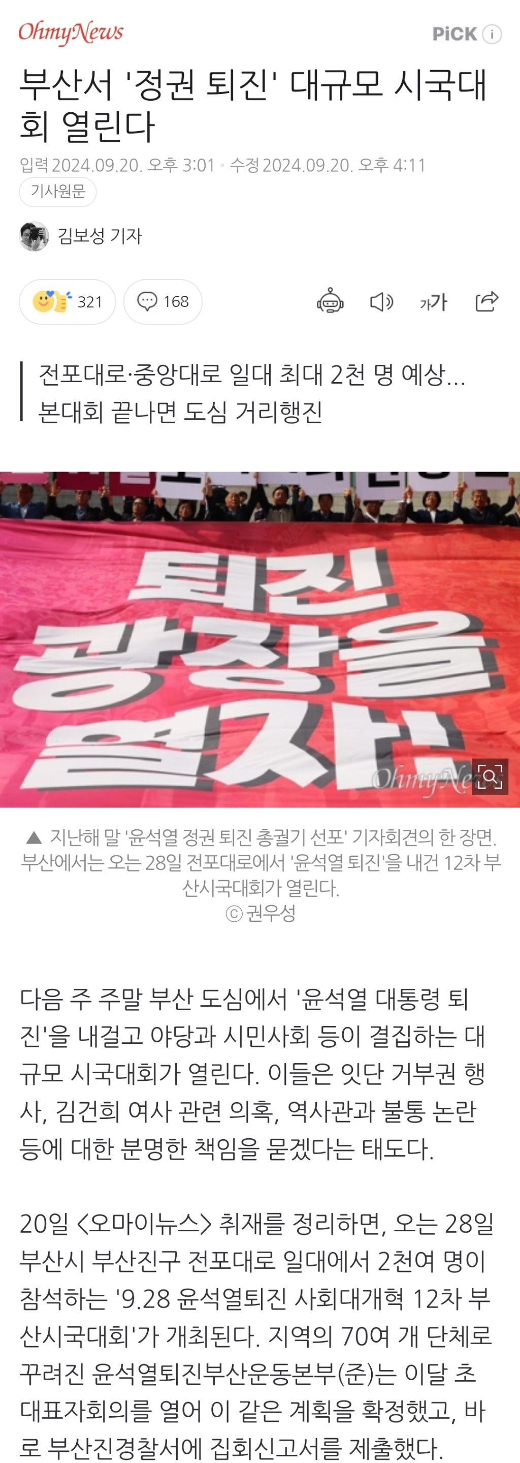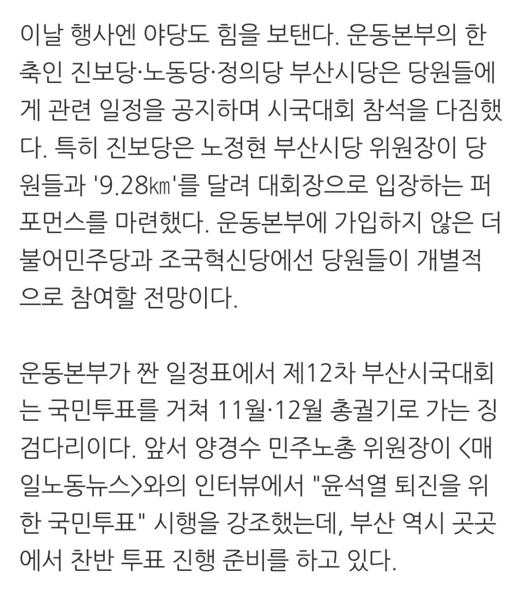 [스크랩] [여시뉴스데스크]부산서 '정권 퇴진' 대규모 시국대회 열린다 (⮕9월 28일 전포동) 작성자천리길|작성시간24.09.26|조회수346 목록 댓글 0 글자크기 작게가 글자크기 크게가 출처: https://naver.me/GZZ91vWo부산서 '정권 퇴진' 대규모 시국대회 열린다▲ 지난해 말 '윤석열 정권 퇴진 총궐기 선포' 기자회견의 한 장면. 부산에서는 오는 28일 전포대로에서 '윤석열 퇴진'을 내건 12차 부산시국대회가 열린다. ⓒ 권우성 다음 주 주말 부산 도심에서n.news.naver.com중략이하 생략전문 출처로 다음검색 스크랩 원문 : *여성시대* 차분한 20대들의 알흠다운 공간 현재 게시글 추가 기능 열기 북마크 공유하기 신고 센터로 신고 댓글 댓글 0 댓글쓰기 답글쓰기 댓글 리스트