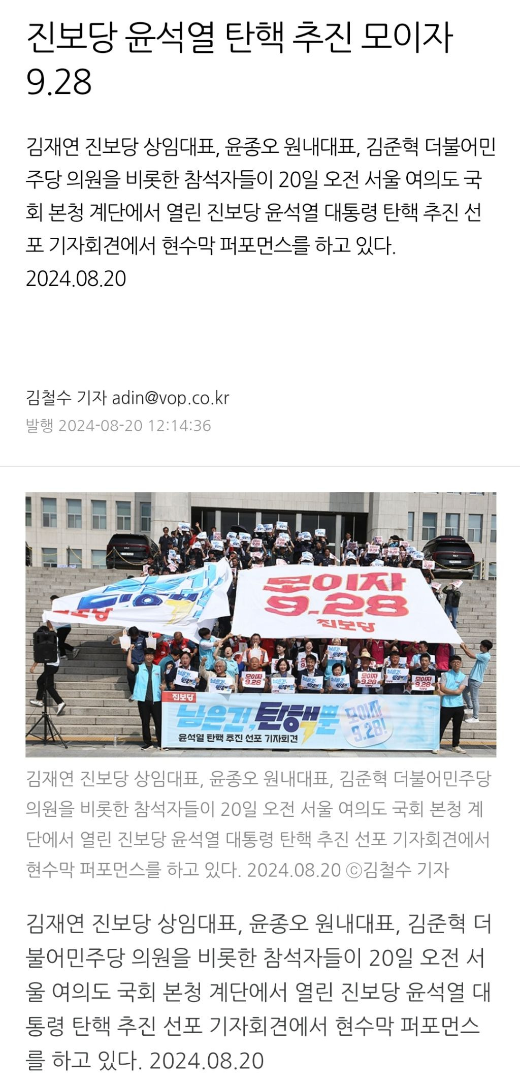 [스크랩] [여시뉴스데스크]진보당 윤석열 탄핵 추진 모이자 9.28 작성자천리길|작성시간24.09.26|조회수334 목록 댓글 0 글자크기 작게가 글자크기 크게가 출처: https://vop.co.kr/A00001659825.html진보당 윤석열 탄핵 추진 모이자 9.28김재연 진보당 상임대표, 윤종오 원내대표, 김준혁 더불어민주당 의원을 비롯한 참석자들이 20일 오전 서울 여의도 국회 본청 계단에서 열린 진보당 윤석열 대통령 탄핵 추진 선포 기자회견에서vop.co.kr원문 출처로 다음검색 스크랩 원문 : *여성시대* 차분한 20대들의 알흠다운 공간 현재 게시글 추가 기능 열기 북마크 공유하기 신고 센터로 신고 댓글 댓글 0 댓글쓰기 답글쓰기 댓글 리스트
