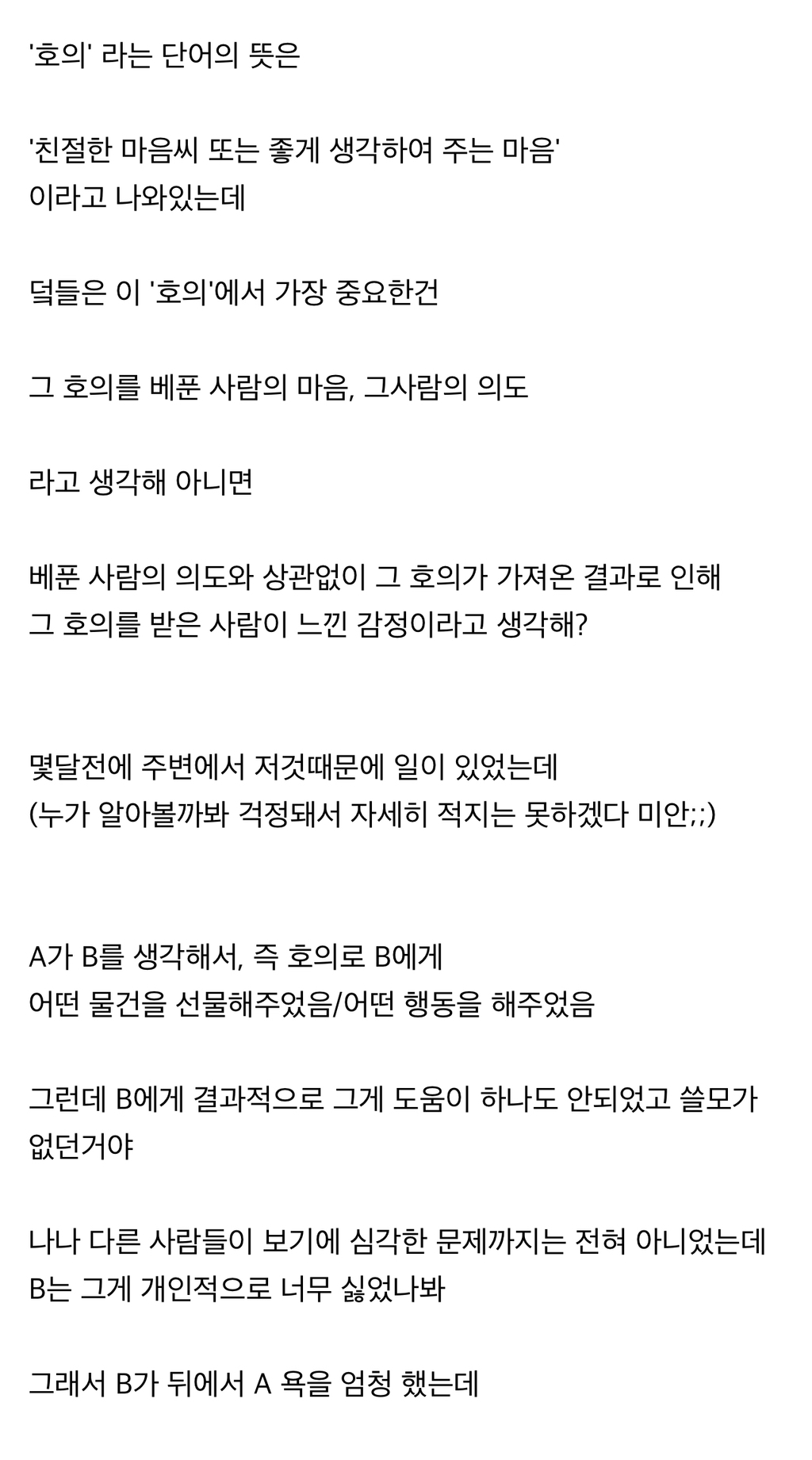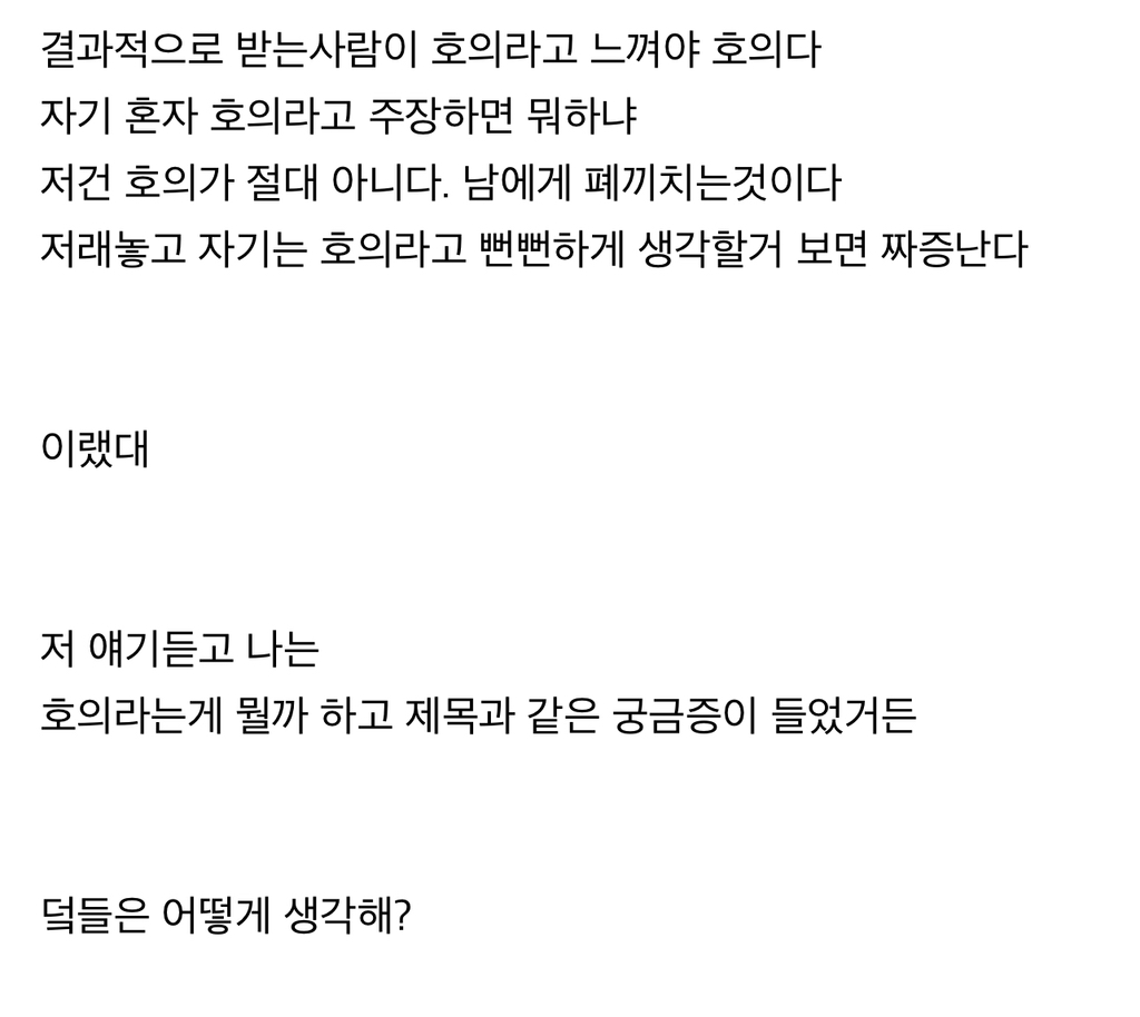 [스크랩] [흥미돋]호의' 라는것은 베푼 사람의 마음이 중요한것인지 결과적으로 그걸 받은 사람이 느낀 감정이 중요한것인지 궁금한 글 작성자크크크크치킨|작성시간24.09.26|조회수1,480 목록 댓글 23 글자크기 작게가 글자크기 크게가 출처: https://theqoo.net/review/2155722291더쿠 - '호의' 라는것은 베푼 사람의 마음이 중요한것인지 결과적으로 그걸 받은 사람이 느낀 감여기를 눌러 링크를 확인하세요theqoo.net 다음검색 스크랩 원문 : *여성시대* 차분한 20대들의 알흠다운 공간 현재 게시글 추가 기능 열기 북마크 공유하기 신고 센터로 신고 댓글 댓글 23 댓글쓰기 답글쓰기 댓글 리스트 작성자흘러내리는연두부 | 작성시간 24.09.26 받는사람이 더 중요하지만 둘 다 정말 중요함 작성자강쥐핑 | 작성시간 24.09.26 받는 사람 작성자9월 21일 | 작성시간 24.09.26 너무 케바케인 것 같아 작성자어설픈어피치 | 작성시간 24.09.26 상황에따라 태도에따라 다를듯 작성자NOOTNOOT | 작성시간 24.09.27 호의는 호의에서 끝내야되는데 생색내서 그런듯그럼 받는 사람 입장에선 도움도 안됐는데 생색까지내서 개짱나지그게아니면 머가 중요함 댓글 전체보기