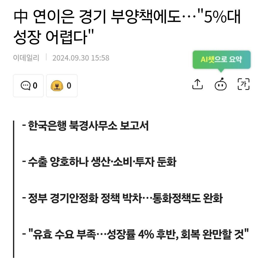 2. 중국 수출이 역대급 호황이라도 수출이 중국 경제에서 차지하는 비중이 고작 19%대라 올해 성장률 4% 대 2026년 3% 대 거론되는등 내수 소비가 망한 상황에선 해답이 안보임.