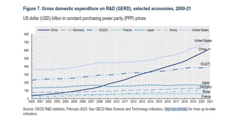 [ 유럽연합을 한참 능가한 중국의 기술 개발 투자액. 순위는 미국, 중국, 일본, 독일, 한국, 프랑스 순 ]