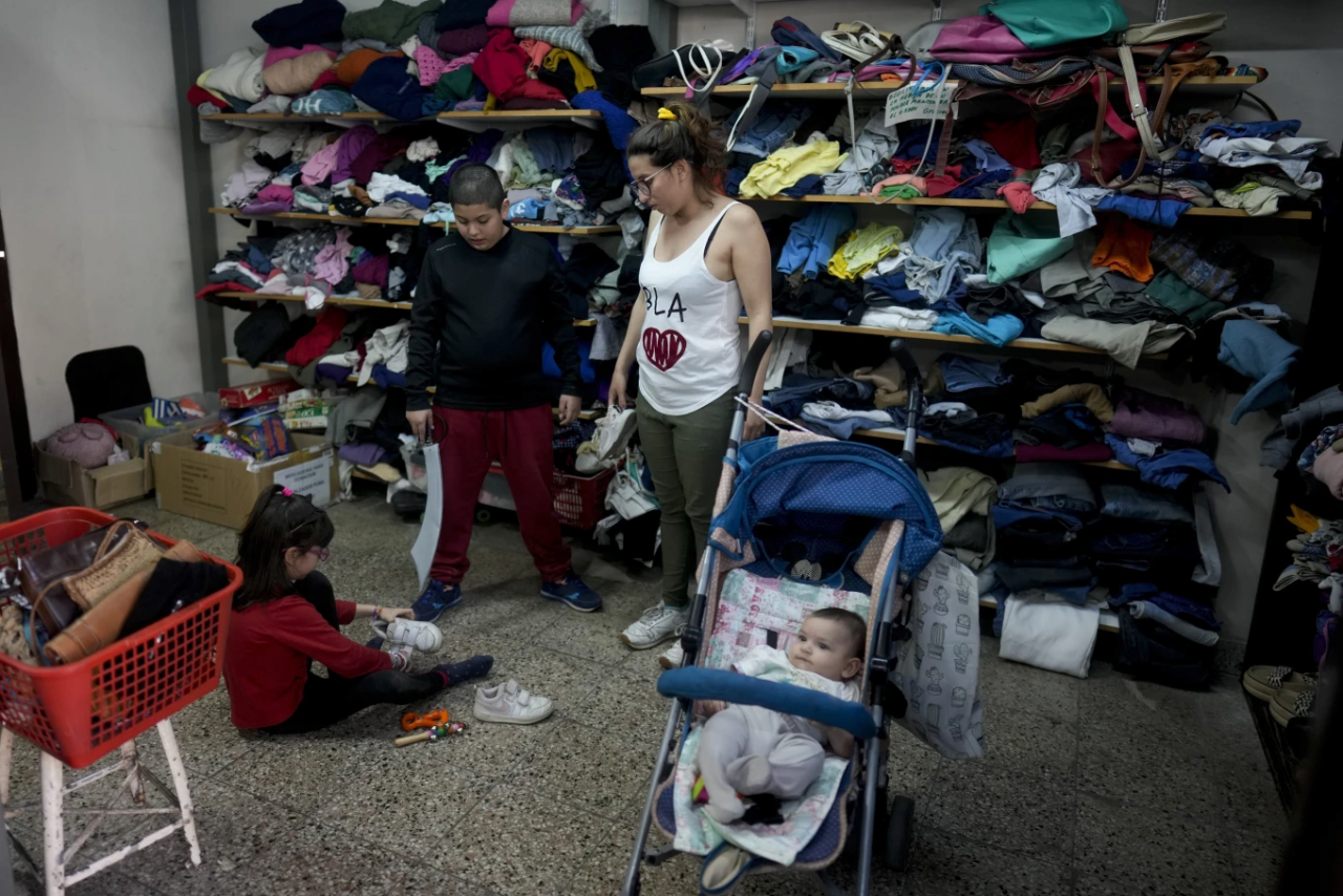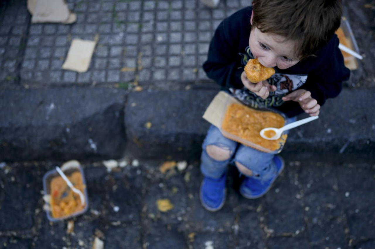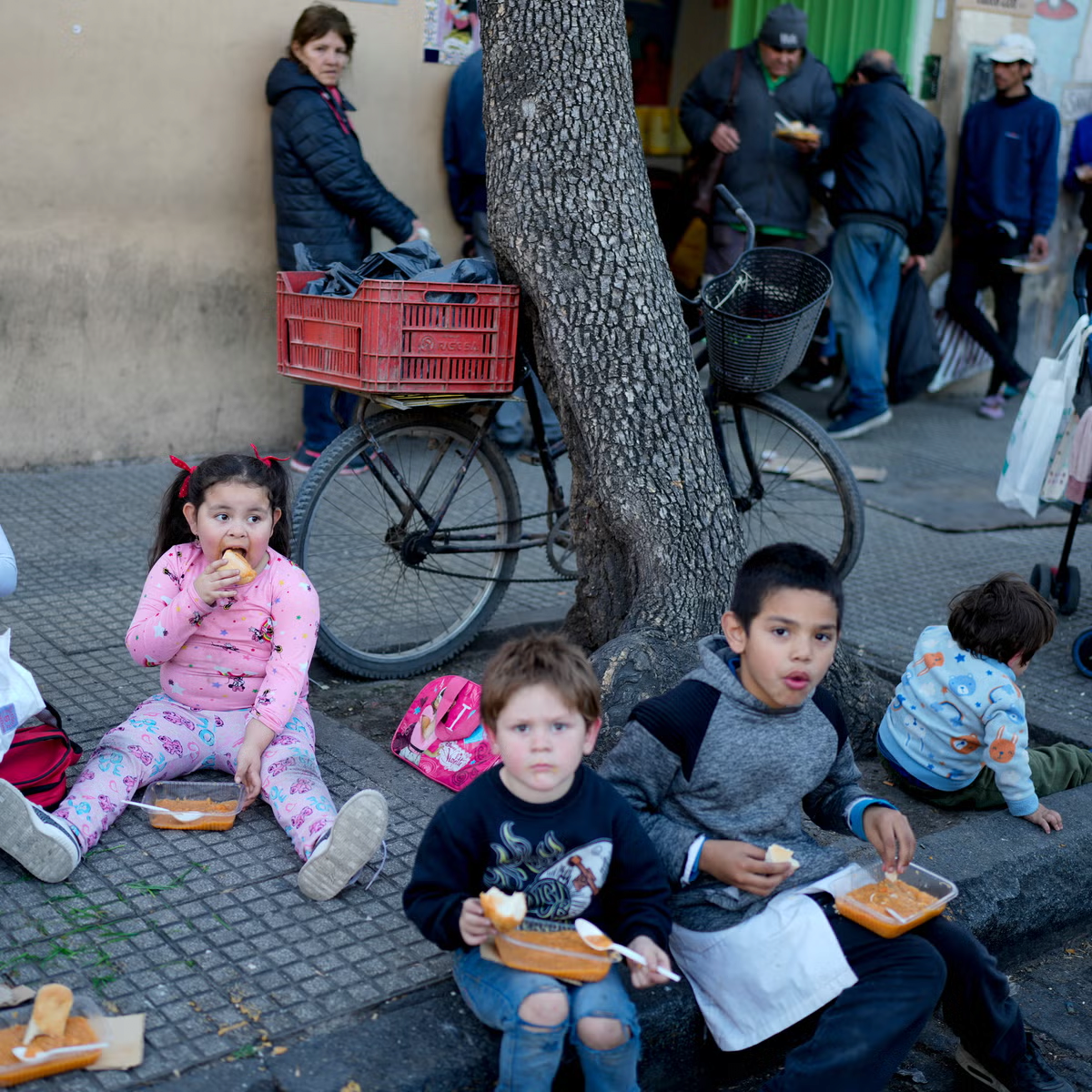 [부에노스아이레스 외곽, 길거리에서 무료 배식 받은 음식 먹는 아이들]