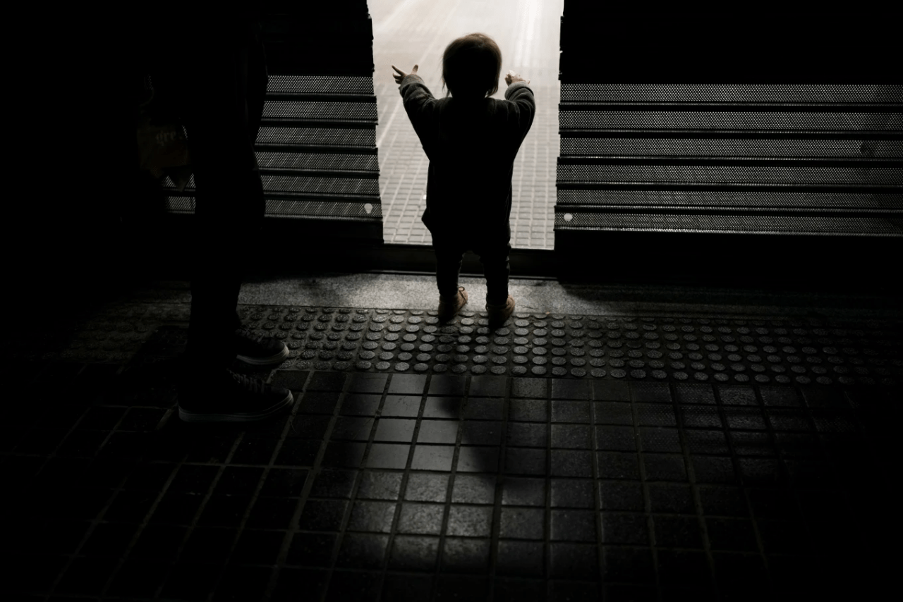 [중고 의류 박람회?에서 신발 고르는 아이]