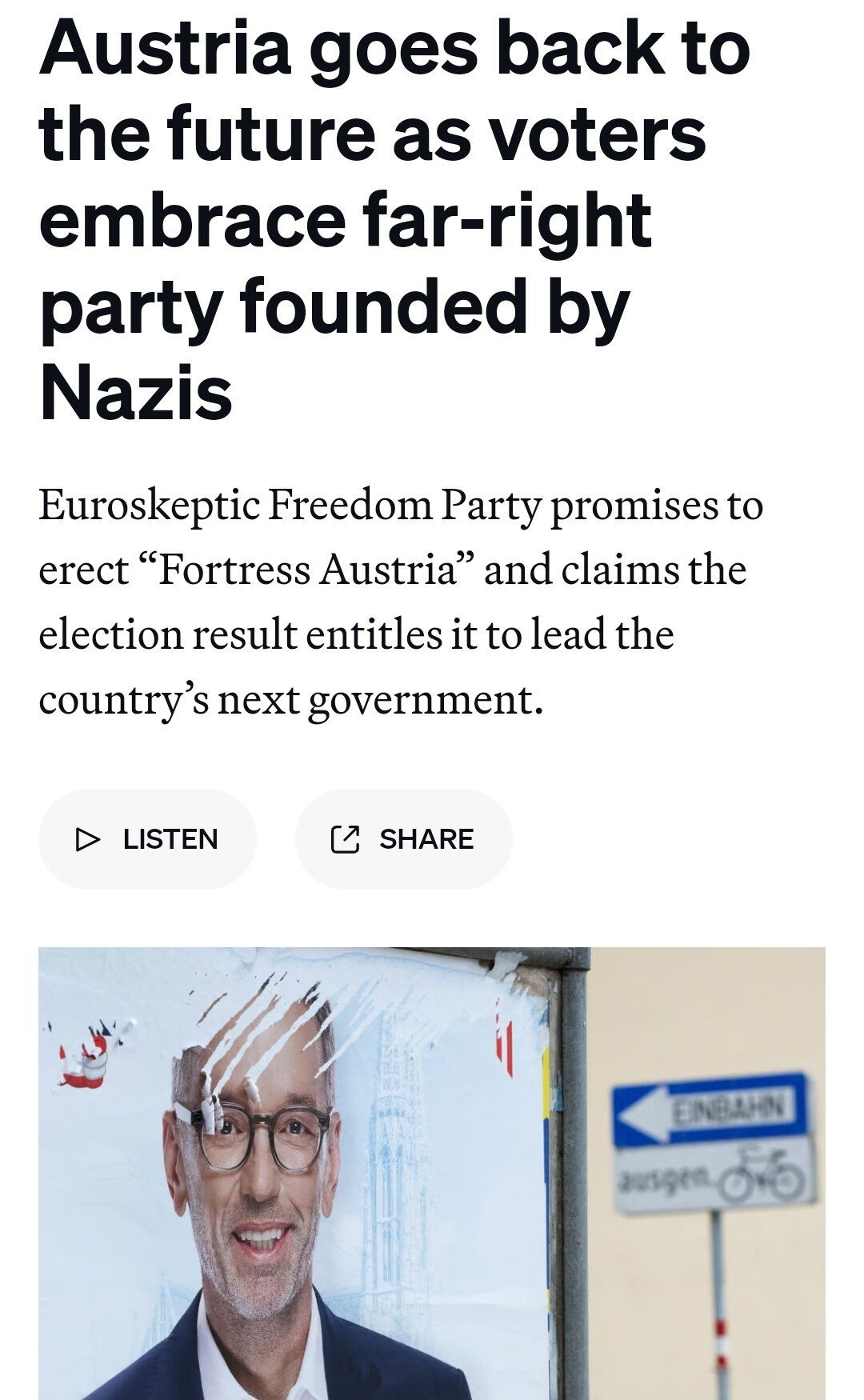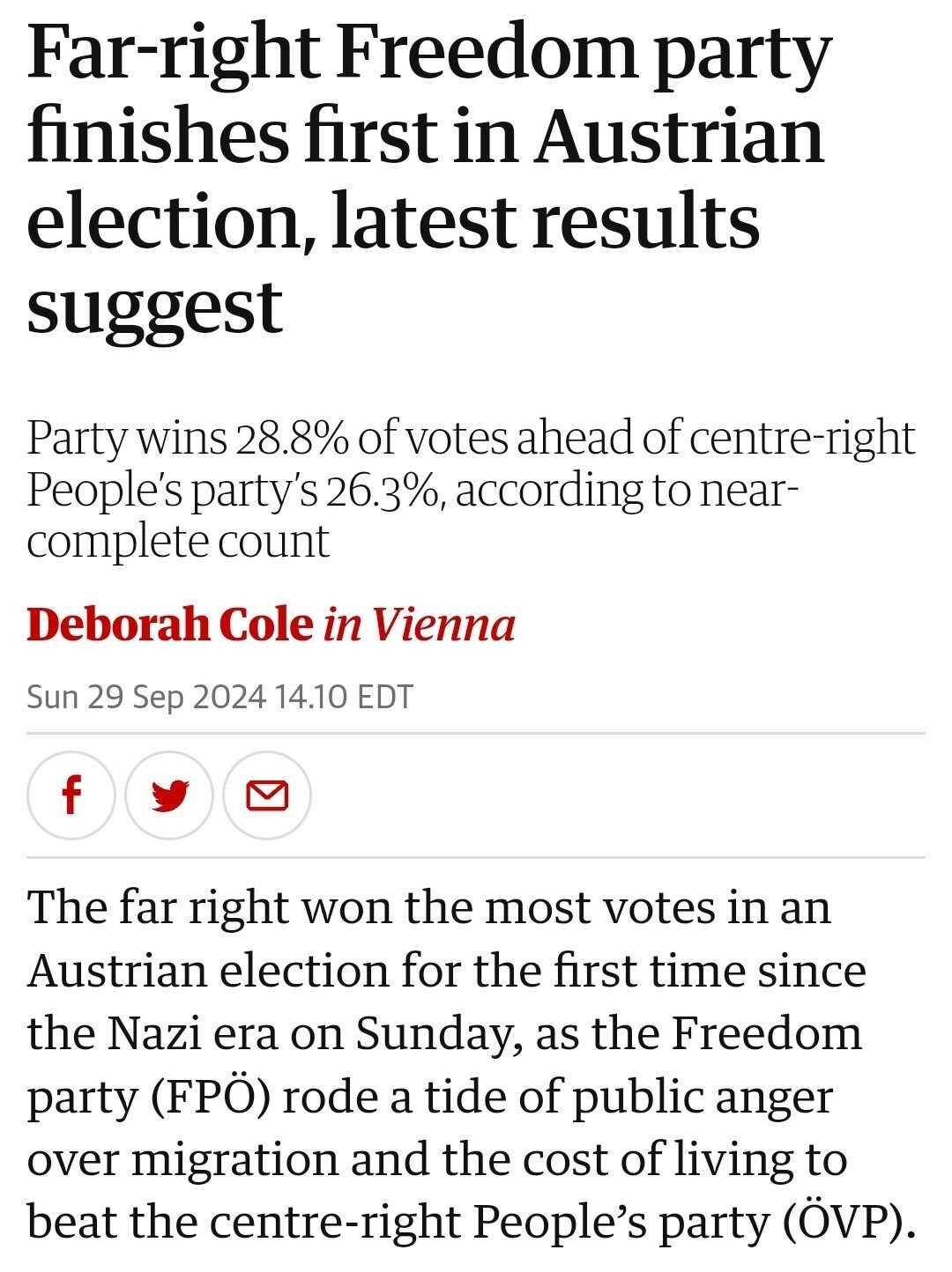 극우 성향의 오스트리아 자유당이 이번 총선에서 26%의 득표로 21%를 득표한 사회민주당을 꺾고 승리를 거뒀다는 그리 놀랍지는 않은 소식이 들려옴.