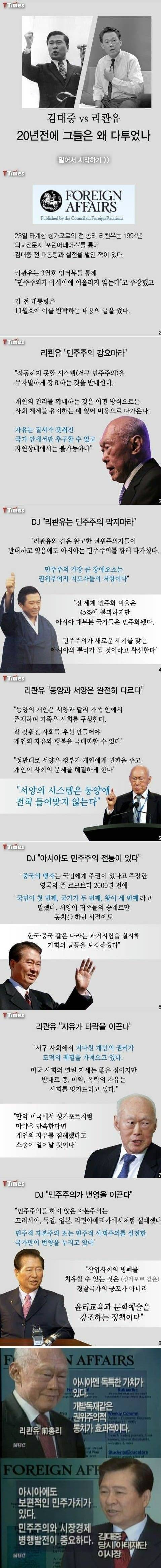 그런데 독재에 의존하는 게 과연 안전한가? 리더도 사람인데 정말 공정하게 흘러갈 것인가 하는 의문이 들고 실제로 싱가포르를 제외한 모든 전체주의 권위주의 국가는 모조리 비효율과 부정부패가 심각함. 싱가포르만이 작은 규모를 이용해 이상적 통치체제를 갖추고 있을 뿐임..난 김대중 전대통령의 말이 맞다고 생각함 -