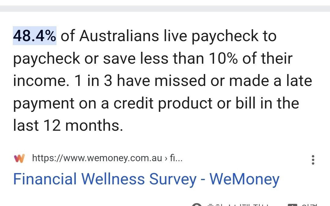 호주 인구 48.4% 가 저축을 못하거나 월급의 10% 미만으로 저축함. 그리고 호주 인구 3분의1이 신용카드 지불 연체.