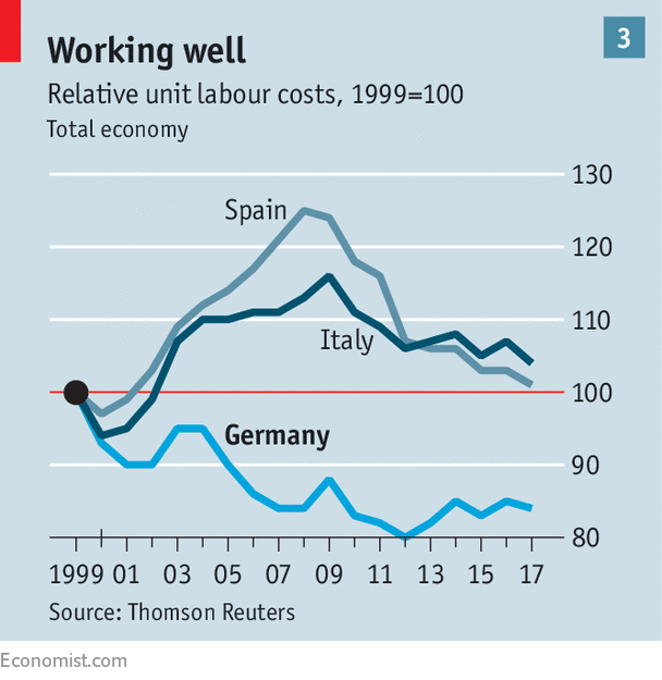 독일보다 경제력과 산업 경쟁력이 약한 이탈리아 스페인에 동유럽 국가들까지 합쳐지면서 보다 싼 유로로 판매가 가능해지며 가격경쟁력을 얻게됨.