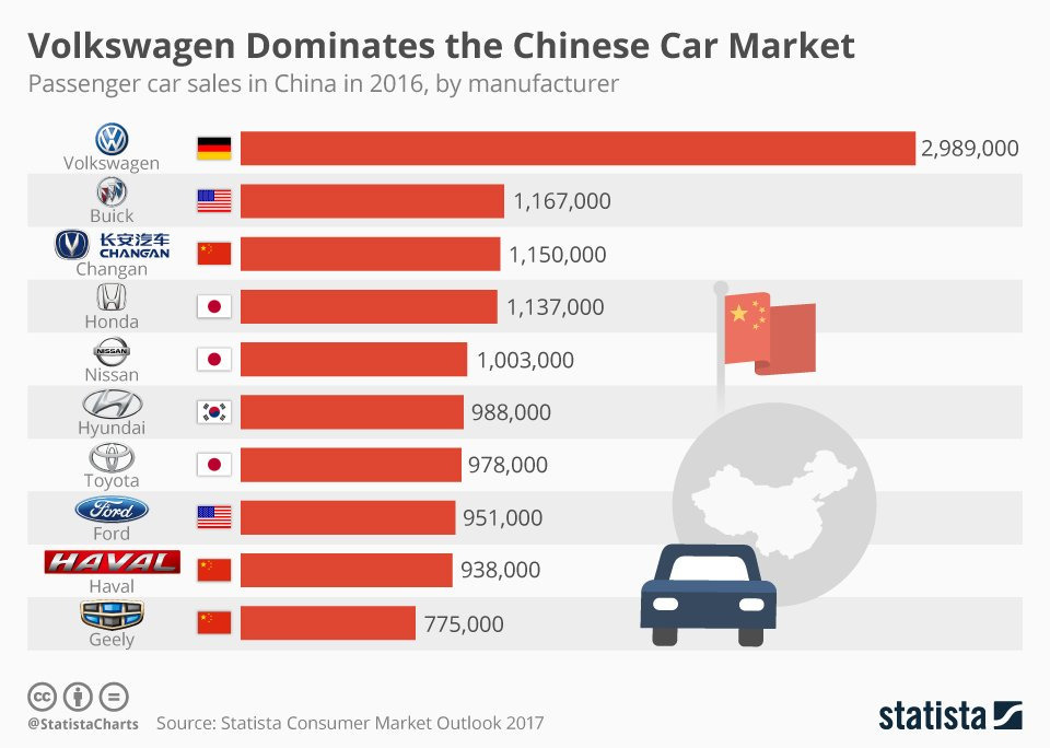 결국 말 그대로 대박이 나서 중국에서 가장 많이 팔리는 차 브랜드는 폭스바겐을 위시로 한 독일 자동차 브랜드였음.