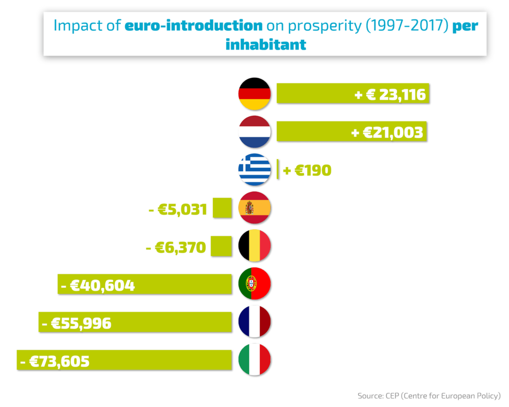 [ 유로 도입으로 이득을 본 독일과 네덜란드와 크게 손해를 본 프랑스와 이탈리아 ]