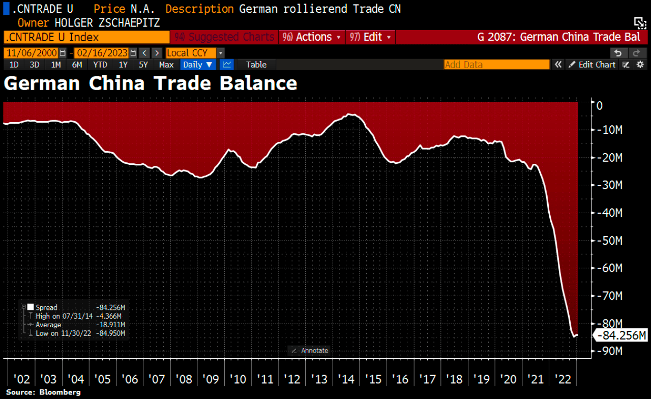 예전에 미국이 중국에게 제조업 일자리 털리던걸 독일도 이제 겪고 있는 셈. 그 결과 독일의 대중국 무역적자 폭은 역대급으로 늘어가고 있고.