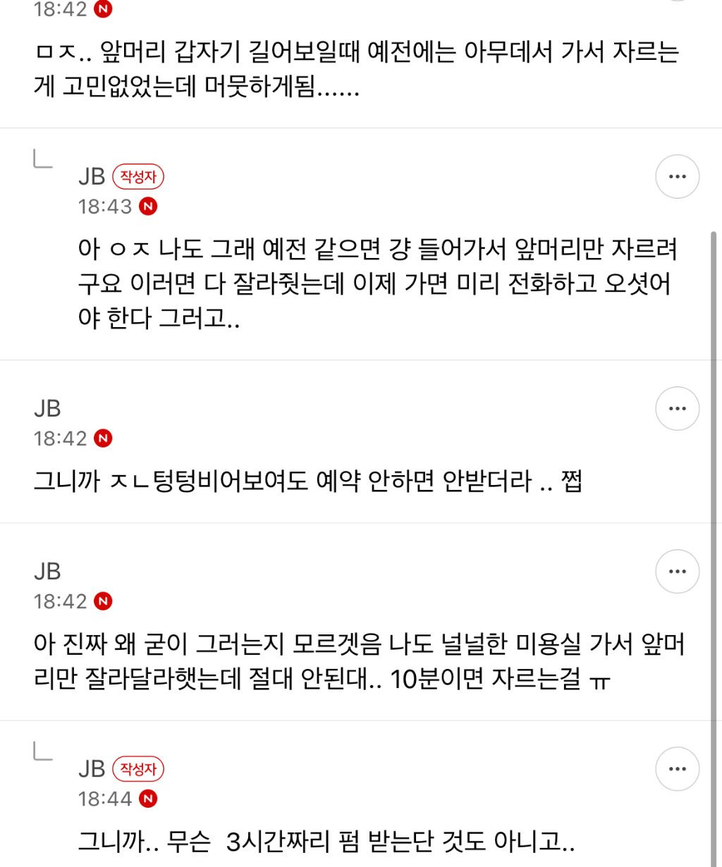 작성자겨울 작성시간 24.10.04 난 예약없이 맨날 했는데.. 동네 미용실 아니고 이름있는데인데.. 받고 싶은 사람한테 예약해도 그 사람이 안해주고 거의 인턴이 해줘서 걍 미용실을 안가게됐음 앞머리 정도는 내가 자르고