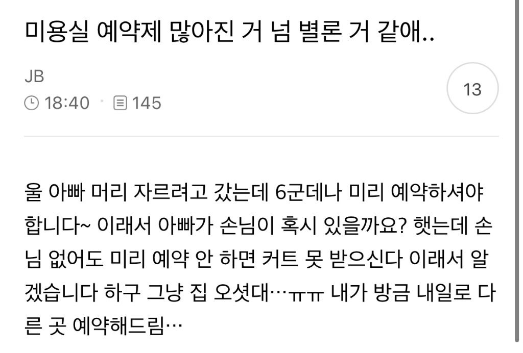 작성자EDG 아펠리오스 작성시간 24.10.04 ㄹㅇ 실력 ㅈ도 없는 미용실에서 허울만 ㅈㄴ 해대서 짜증나